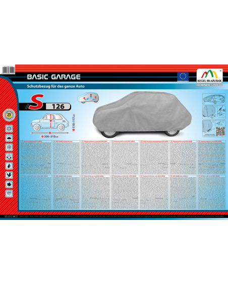 Vysoce kvalitní, celoroční plachta na auto BASIC GARAGE – vodovzdorná a paropropustná. Díky spojení dvou druhů materiálu si plachta zachovává téměř úplnou těsnost dokonce i při intenzivním dešti a zároveň, za kladné teploty okolí, odvádí ven vlhkost hromadící se pod plachtou. Plachta chrání celé auto společně s jeho dolní částí před nepříznivým vlivem vnějšího prostředí. Je vyrobena z na vnitřní straně hladkého materiálu, nepoškrábe karosérii. Upevňuje se s pomocí stahovacího lemu s lankem kolem celého vozidla, v případě správného zavázání zaručuje bezpečnost i během nárazů větru. Díky širokému spektru tvarů a velikostí jsou plachty z této řady (stejně jako i naše jiné plachty) dobře přizpůsobené konkrétním autům. Plachty Basic Garage mají ověřenou odolnost proti slunci a jiným atmosférickým faktorům, což potvrzuje písemná záruka 25 měsíců přiložená ke každému výrobku.