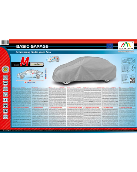 Vysoce kvalitní, celoroční plachta na auto BASIC GARAGE – vodovzdorná a paropropustná. Díky spojení dvou druhů materiálu si plachta zachovává téměř úplnou těsnost dokonce i při intenzivním dešti a zároveň, za kladné teploty okolí, odvádí ven vlhkost hromadící se pod plachtou. Plachta chrání celé auto společně s jeho dolní částí před nepříznivým vlivem vnějšího prostředí. Je vyrobena z na vnitřní straně hladkého materiálu, nepoškrábe karosérii. Upevňuje se s pomocí stahovacího lemu s lankem kolem celého vozidla, v případě správného zavázání zaručuje bezpečnost i během nárazů větru. Díky širokému spektru tvarů a velikostí jsou plachty z této řady (stejně jako i naše jiné plachty) dobře přizpůsobené konkrétním autům. Plachty Basic Garage mají ověřenou odolnost proti slunci a jiným atmosférickým faktorům, což potvrzuje písemná záruka 25 měsíců přiložená ke každému výrobku.