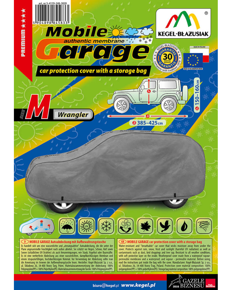 Vysoce kvalitní plachty na auto MOBILE GARAGE- voděodolné a paropropustné. Jsou ušité z nepromokavé paropropustné membrány a nesnadno promokavých materiálů, které velice dobře propouštějí páru, zachovávají si téměř naprostou těsnost a zároveň odvádějí vlhkost hromadící se pod potahem. Chrání celé auto společně s jeho dolní částí před škodlivým vlivem prostředí. Jsou odolné vůči působení UV záření. Upevňuje se s pomocí stahovacího lemu s lankem kolem celého vozidla, v případě správného zavázání zaručuje bezpečnost i během nárazů větru. Díky širokému spektru tvarů a barev jsou potahy dobře přizpůsobeny různým automobilům. Poskytnuta až do 30-měsíční záruka vám dá jistotu, že kupujete nejvyšší kvality výrobku.