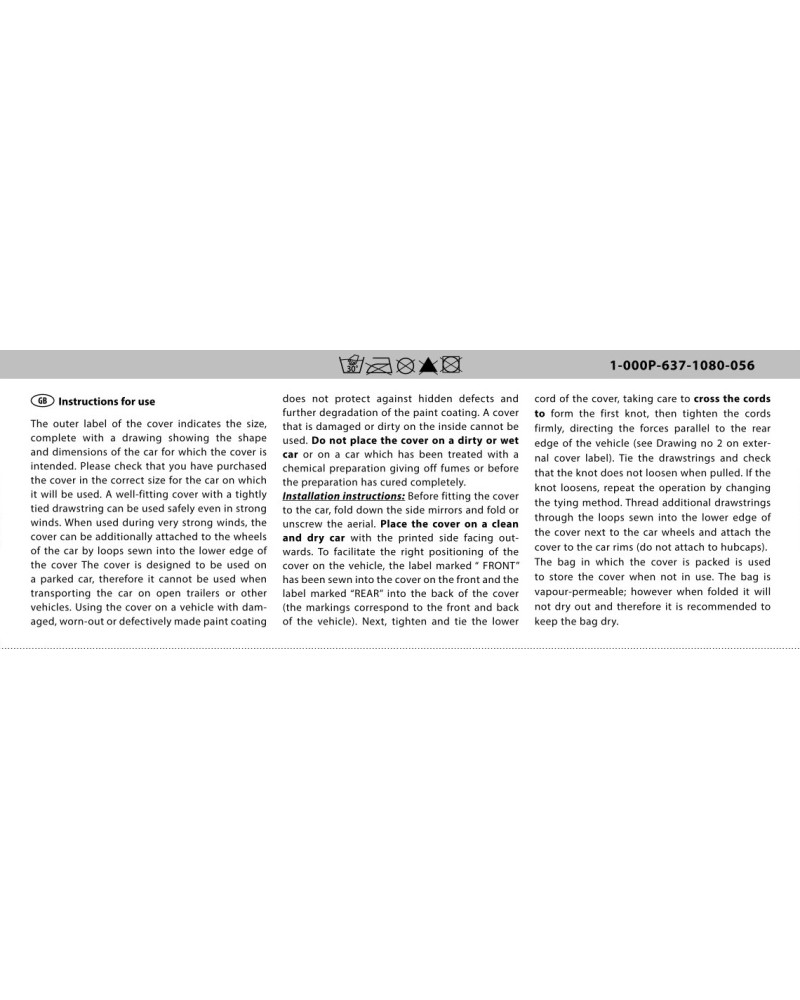Před nasazením plachty na automobil složte boční zpětná zrcátka a složte nebo odšroubujte anténu. Čisté a suché auto přikryjte plachtou tak, aby strana s potiskem byla na vnější straně. Pro snadnější nasazování krycí plachty na automobil je do plachty našitá nášivka FRONT v její přední části a REAR v její zadní části (označení odpovídá přední a zadní straně automobilu). Překřižte stahovací lanka, jednou obtočte kolem sebe a následně silně stáhněte rovnoměrnou silou směrem k zadní hraně vozidla (viz obrázek 2 vnější štítku plachty). Konce stahovacího lanka zavažte na uzel a zkontrolujte, zda se uzel při zatažení za lanko neuvolňuje. Pokud se uzel uvolní, zopakujte předchozí krok, ale použijte jiný způsob vázání uzlu. Dodatečná lanka protáhněte smyčkami všitými do dolního lemu krycí plachty vedle kol automobilu a plachtu připevněte jejich pomocí k diskům automobilu (nikoliv k poklicím).