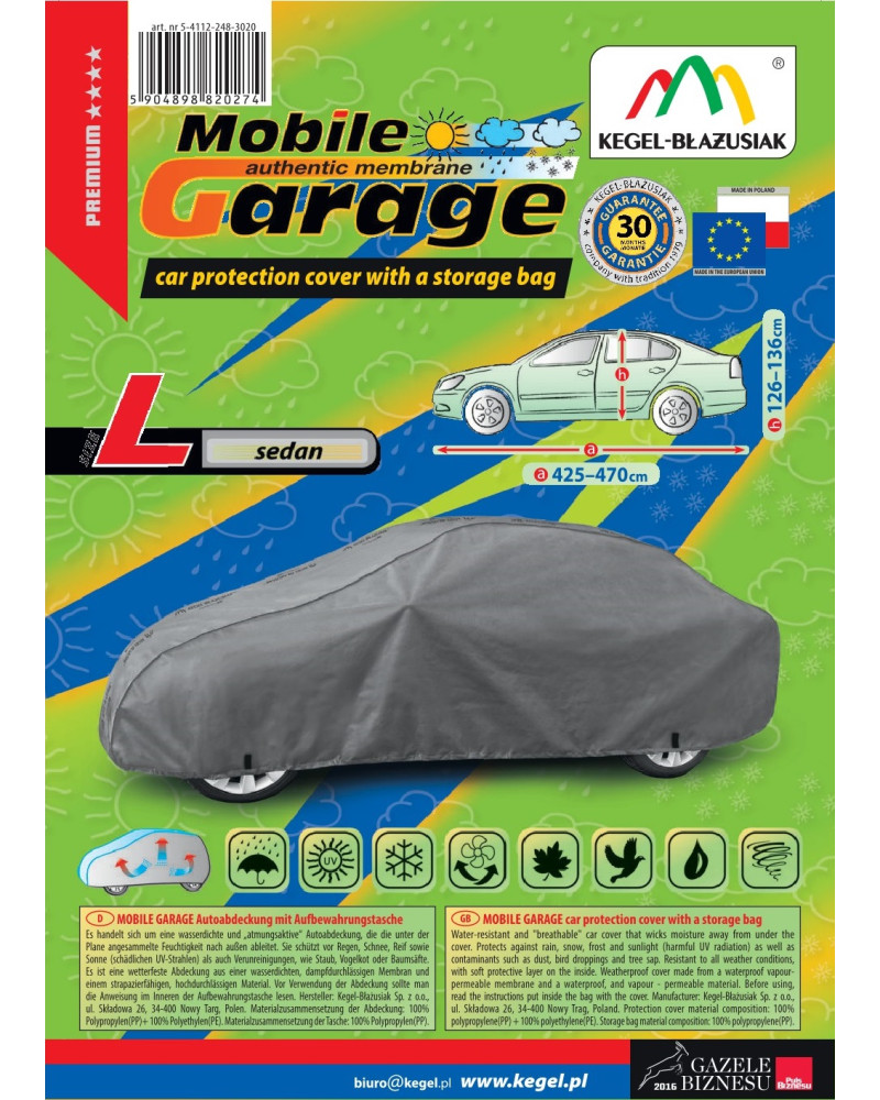 Vysoce kvalitní plachty na auto MOBILE GARAGE- voděodolné a paropropustné. Jsou ušité z nepromokavé paropropustné membrány a nesnadno promokavých materiálů, které velice dobře propouštějí páru, zachovávají si téměř naprostou těsnost a zároveň odvádějí vlhkost hromadící se pod potahem. Chrání celé auto společně s jeho dolní částí před škodlivým vlivem prostředí. Jsou odolné vůči působení UV záření. Upevňuje se s pomocí stahovacího lemu s lankem kolem celého vozidla, v případě správného zavázání zaručuje bezpečnost i během nárazů větru. Díky širokému spektru tvarů a barev jsou potahy dobře přizpůsobeny různým automobilům. Poskytnuta až do 30-měsíční záruka vám dá jistotu, že kupujete nejvyšší kvality výrobku.