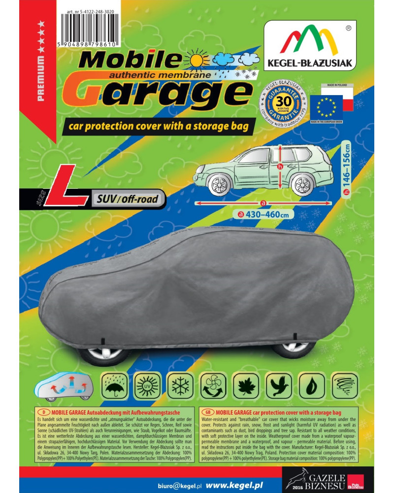 Vysoce kvalitní plachty na auto MOBILE GARAGE- voděodolné a paropropustné. Jsou ušité z nepromokavé paropropustné membrány a nesnadno promokavých materiálů, které velice dobře propouštějí páru, zachovávají si téměř naprostou těsnost a zároveň odvádějí vlhkost hromadící se pod potahem. Chrání celé auto společně s jeho dolní částí před škodlivým vlivem prostředí. Jsou odolné vůči působení UV záření. Upevňuje se s pomocí stahovacího lemu s lankem kolem celého vozidla, v případě správného zavázání zaručuje bezpečnost i během nárazů větru. Díky širokému spektru tvarů a barev jsou potahy dobře přizpůsobeny různým automobilům. Poskytnuta až do 30-měsíční záruka vám dá jistotu, že kupujete nejvyšší kvality výrobku.