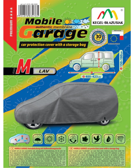 Vysoce kvalitní plachty na auto MOBILE GARAGE- voděodolné a paropropustné. Jsou ušité z nepromokavé paropropustné membrány a nesnadno promokavých materiálů, které velice dobře propouštějí páru, zachovávají si téměř naprostou těsnost a zároveň odvádějí vlhkost hromadící se pod potahem. Chrání celé auto společně s jeho dolní částí před škodlivým vlivem prostředí. Jsou odolné vůči působení UV záření. Upevňuje se s pomocí stahovacího lemu s lankem kolem celého vozidla, v případě správného zavázání zaručuje bezpečnost i během nárazů větru. Díky širokému spektru tvarů a barev jsou potahy dobře přizpůsobeny různým automobilům. Poskytnuta až do 30-měsíční záruka vám dá jistotu, že kupujete nejvyšší kvality výrobku.