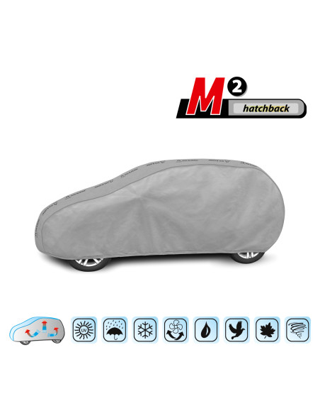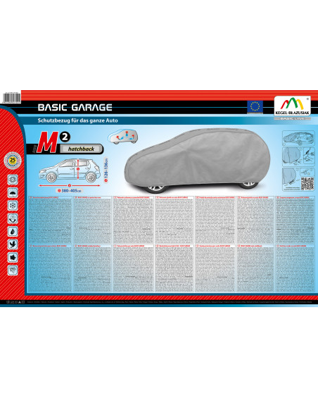 Vysoce kvalitní, celoroční plachta na auto BASIC GARAGE – vodovzdorná a paropropustná. Díky spojení dvou druhů materiálu si plachta zachovává téměř úplnou těsnost dokonce i při intenzivním dešti a zároveň, za kladné teploty okolí, odvádí ven vlhkost hromadící se pod plachtou. Plachta chrání celé auto společně s jeho dolní částí před nepříznivým vlivem vnějšího prostředí. Je vyrobena z na vnitřní straně hladkého materiálu, nepoškrábe karosérii. Upevňuje se s pomocí stahovacího lemu s lankem kolem celého vozidla, v případě správného zavázání zaručuje bezpečnost i během nárazů větru. Díky širokému spektru tvarů a velikostí jsou plachty z této řady (stejně jako i naše jiné plachty) dobře přizpůsobené konkrétním autům. Plachty Basic Garage mají ověřenou odolnost proti slunci a jiným atmosférickým faktorům, což potvrzuje písemná záruka 25 měsíců přiložená ke každému výrobku.