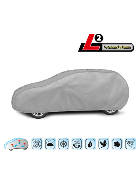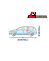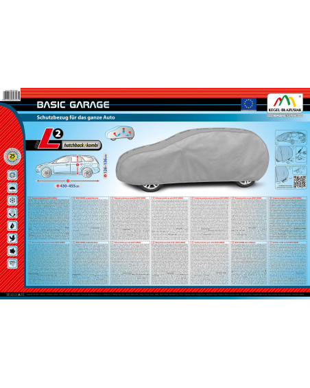 Vysoce kvalitní, celoroční plachta na auto BASIC GARAGE – vodovzdorná a paropropustná. Díky spojení dvou druhů materiálu si plachta zachovává téměř úplnou těsnost dokonce i při intenzivním dešti a zároveň, za kladné teploty okolí, odvádí ven vlhkost hromadící se pod plachtou. Plachta chrání celé auto společně s jeho dolní částí před nepříznivým vlivem vnějšího prostředí. Je vyrobena z na vnitřní straně hladkého materiálu, nepoškrábe karosérii. Upevňuje se s pomocí stahovacího lemu s lankem kolem celého vozidla, v případě správného zavázání zaručuje bezpečnost i během nárazů větru. Díky širokému spektru tvarů a velikostí jsou plachty z této řady (stejně jako i naše jiné plachty) dobře přizpůsobené konkrétním autům. Plachty Basic Garage mají ověřenou odolnost proti slunci a jiným atmosférickým faktorům, což potvrzuje písemná záruka 25 měsíců přiložená ke každému výrobku.