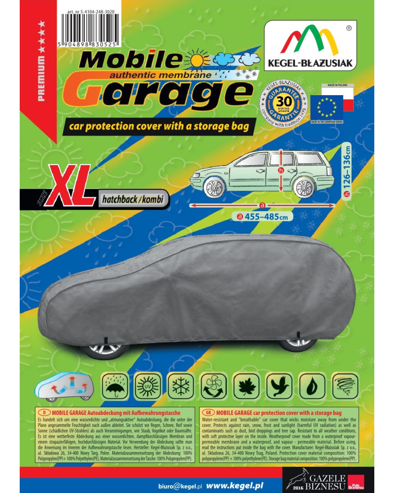 Vysoce kvalitní plachty na auto MOBILE GARAGE- voděodolné a paropropustné. Jsou ušité z nepromokavé paropropustné membrány a nesnadno promokavých materiálů, které velice dobře propouštějí páru, zachovávají si téměř naprostou těsnost a zároveň odvádějí vlhkost hromadící se pod potahem. Chrání celé auto společně s jeho dolní částí před škodlivým vlivem prostředí. Jsou odolné vůči působení UV záření. Upevňuje se s pomocí stahovacího lemu s lankem kolem celého vozidla, v případě správného zavázání zaručuje bezpečnost i během nárazů větru. Díky širokému spektru tvarů a barev jsou potahy dobře přizpůsobeny různým automobilům. Poskytnuta až do 30-měsíční záruka vám dá jistotu, že kupujete nejvyšší kvality výrobku.