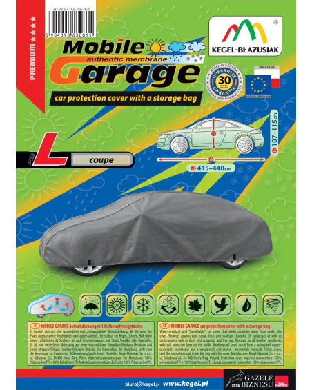 Vysoce kvalitní plachty na auto MOBILE GARAGE- voděodolné a paropropustné. Jsou ušité z nepromokavé paropropustné membrány a nesnadno promokavých materiálů, které velice dobře propouštějí páru, zachovávají si téměř naprostou těsnost a zároveň odvádějí vlhkost hromadící se pod potahem. Chrání celé auto společně s jeho dolní částí před škodlivým vlivem prostředí. Jsou odolné vůči působení UV záření. Upevňuje se s pomocí stahovacího lemu s lankem kolem celého vozidla, v případě správného zavázání zaručuje bezpečnost i během nárazů větru. Díky širokému spektru tvarů a barev jsou potahy dobře přizpůsobeny různým automobilům. Poskytnuta až do 30-měsíční záruka vám dá jistotu, že kupujete nejvyšší kvality výrobku.