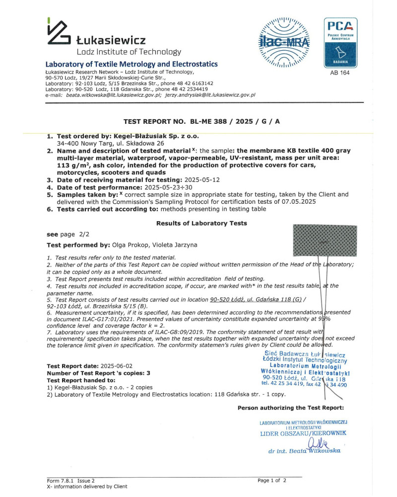 Dobrá krycí plachta musí chránit automobil nejen před atmosférickými srážkami, znečištěním a slunečními paprsky, ale musí být také bezpečná. Právě takové jsou krycí plachty na auta značky Kegel-Błażusiak. Naši odborníci se věnují dlouhodobým zkouškám krycích plachet na automobily. Testujeme je z hlediska účinnosti ochrany proti povětrnostním vlivům, odolnosti proti vodě, propustnosti vodních par směrem ven, bezpečnosti materiálu plachty vůči laku vozidla a účinnosti připevnění plachty na vozidle za běžného i extrémního počasí. Na trh dodáváme pouze takové výrobky, které v dlouhodobých testech dopadly pozitivně.