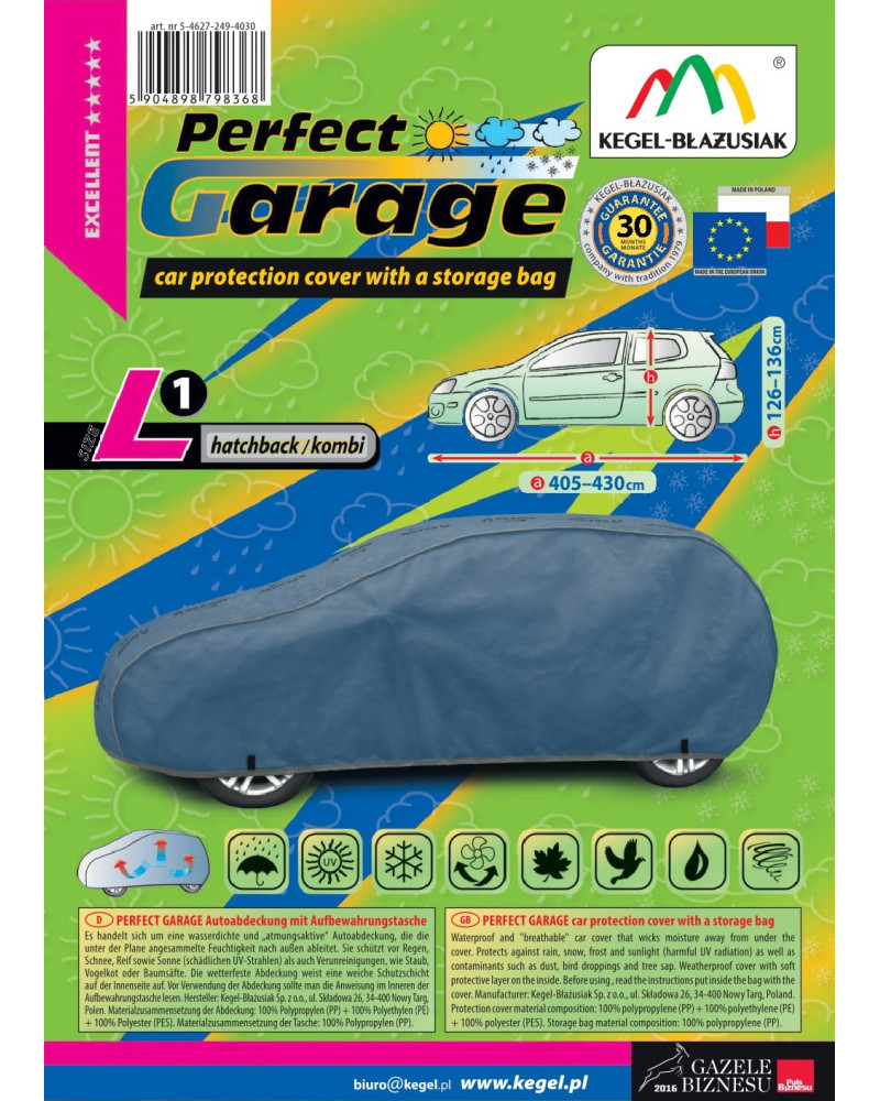 Plachta PERFECT GARAGE je dobře přizpůsobená, pevně připevněná s pomocí tradičního stahovacího lemu s lankem kolem celého auta, vyrobená ze silného a z vnitřní strany hladkého materiálu, díky tomu může být bezpečně používána dokonce i během nárazového větru. Snadno se nasazuje a stahuje. Po složení nezabere plachta příliš místa, proto ji můžete vždy vozit s sebou. Potah Perfect Garage vyrábíme v elegantní a estetické tmavě modré barvě, abychom ho odlišili od jiných plachet. Přesto, že je tmavě modrá barva tmavá, má potah PERFECT GARAGE ještě větší odolnost vůči slunečnímu záření. Horní částí plachty probíhá nápis Kegel-Błażusiak KB Textil, aby potencionální zákazníci, kteří uvidí naši plachtu na zaparkovaném autě, věděli, jakou značku plachty hledat.