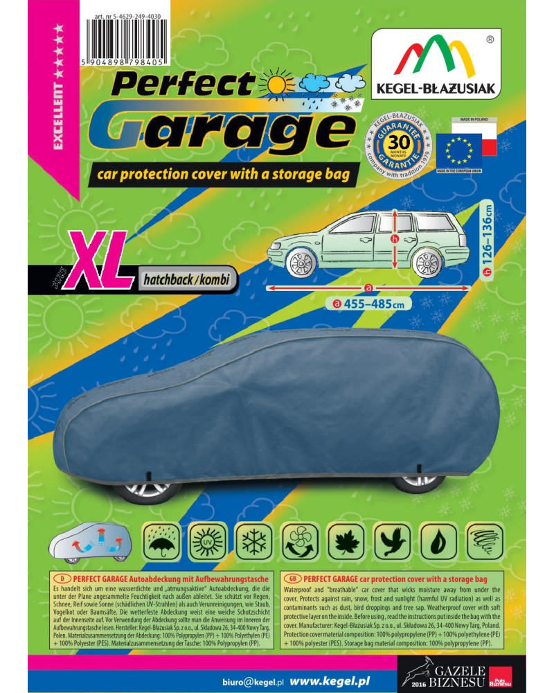 Plachta PERFECT GARAGE je dobře přizpůsobená, pevně připevněná s pomocí tradičního stahovacího lemu s lankem kolem celého auta, vyrobená ze silného a z vnitřní strany hladkého materiálu, díky tomu může být bezpečně používána dokonce i během nárazového větru. Snadno se nasazuje a stahuje. Po složení nezabere plachta příliš místa, proto ji můžete vždy vozit s sebou. Potah Perfect Garage vyrábíme v elegantní a estetické tmavě modré barvě, abychom ho odlišili od jiných plachet. Přesto, že je tmavě modrá barva tmavá, má potah PERFECT GARAGE ještě větší odolnost vůči slunečnímu záření. Horní částí plachty probíhá nápis Kegel-Błażusiak KB Textil, aby potencionální zákazníci, kteří uvidí naši plachtu na zaparkovaném autě, věděli, jakou značku plachty hledat.