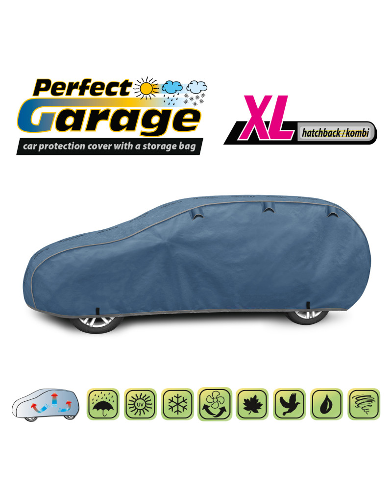 Nová plachta na auto PERFECT GARAGE je vylepšená verze našich oblíbených plachet MOBILE GARAGE. Celá je vyrobená z z paropropustného materiálu s hladkou, na dotyk měkkou spodní částí. Materiál je čtyřvrstvý, s nepromokavou, díky čemuž je potah zcela vodotěsný a zároveň propustný pro vodní páru unikající zpod plachty. Zaparkovaný automobil s nasazeným potahem PERFECT GARAGE zůstane suchý během deště a zároveň se přes materiálu plachty odpařuje vodní pára, díky čemuž bude automobil chráněn před korozí. Kromě toho plachta chrání před důlky koroze, blednutím a ztrátou lesku laku a chromovaných dílů. Chrání před deštěm (také kyselým), sluncem (UV zářením), prachem, ptačími exkrementy, listím a šťávami ze stromů, sněhem a námrazo. Měkká výstelka potahu chrání lak auta před většinou poškrábání a odření. Poskytnuta až do 30-měsíční záruka vám dá jistotu, že kupujete nejvyšší kvality výrobku.