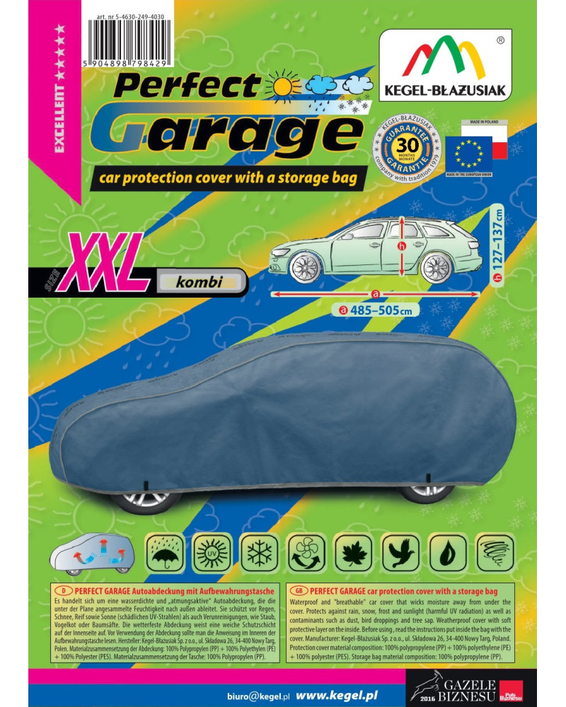 Plachta PERFECT GARAGE je dobře přizpůsobená, pevně připevněná s pomocí tradičního stahovacího lemu s lankem kolem celého auta, vyrobená ze silného a z vnitřní strany hladkého materiálu, díky tomu může být bezpečně používána dokonce i během nárazového větru. Snadno se nasazuje a stahuje. Po složení nezabere plachta příliš místa, proto ji můžete vždy vozit s sebou. Potah Perfect Garage vyrábíme v elegantní a estetické tmavě modré barvě, abychom ho odlišili od jiných plachet. Přesto, že je tmavě modrá barva tmavá, má potah PERFECT GARAGE ještě větší odolnost vůči slunečnímu záření. Horní částí plachty probíhá nápis Kegel-Błażusiak KB Textil, aby potencionální zákazníci, kteří uvidí naši plachtu na zaparkovaném autě, věděli, jakou značku plachty hledat.