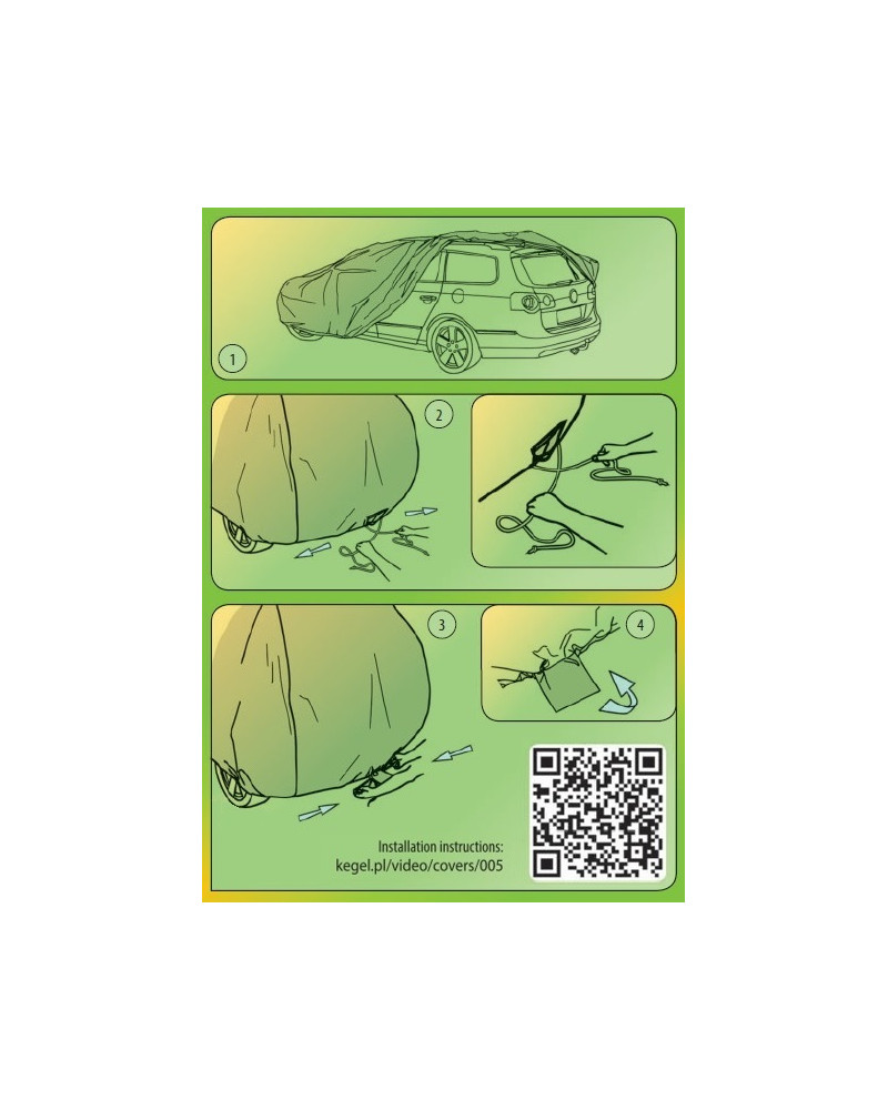 Před nasazením plachty na automobil složte boční zpětná zrcátka a složte nebo odšroubujte anténu. Čisté a suché auto přikryjte plachtou tak, aby strana s potiskem byla na vnější straně. Pro snadnější nasazování krycí plachty na automobil je do plachty našitá nášivka FRONT v její přední části a REAR v její zadní části (označení odpovídá přední a zadní straně automobilu). Překřižte stahovací lanka, jednou obtočte kolem sebe a následně silně stáhněte rovnoměrnou silou směrem k zadní hraně vozidla (viz obrázek 2 vnější štítku plachty). Konce stahovacího lanka zavažte na uzel a zkontrolujte, zda se uzel při zatažení za lanko neuvolňuje. Pokud se uzel uvolní, zopakujte předchozí krok, ale použijte jiný způsob vázání uzlu. Dodatečná lanka protáhněte smyčkami všitými do dolního lemu krycí plachty vedle kol automobilu a plachtu připevněte jejich pomocí k diskům automobilu (nikoliv k poklicím).