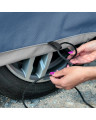 Textilní materiál, z něhož je plachta vyrobena, se přizpůsobí jak o něco menšímu, tak i většímu autu podobného tvaru, s rozměry nepřekračujícímu výše uvedený obvod.