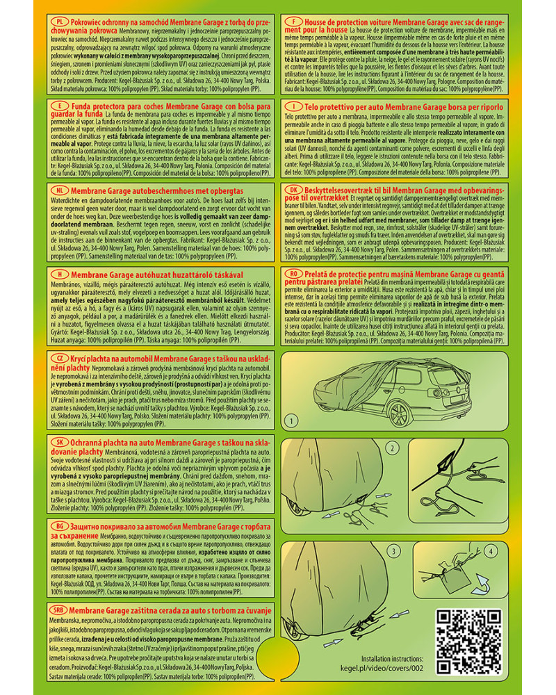 Nepromokavá a zároveň prodyšná membránová krycí plachta na automobil Membrane Garage. Je nepromokavá i za intenzívního deště, zároveň je prodyšná a odvádí vlhkost ven. Krycí plachta je vyrobená z membrány s vysokou prodyšností (prostupností par) a je odolná proti povětrnostním podmínkám. Chrání proti dešti, sněhu, jinovatce, slunečním paprskům (škodlivému UV záření) a nečistotám, jako je prach, ptačí trus nebo míza stromů.