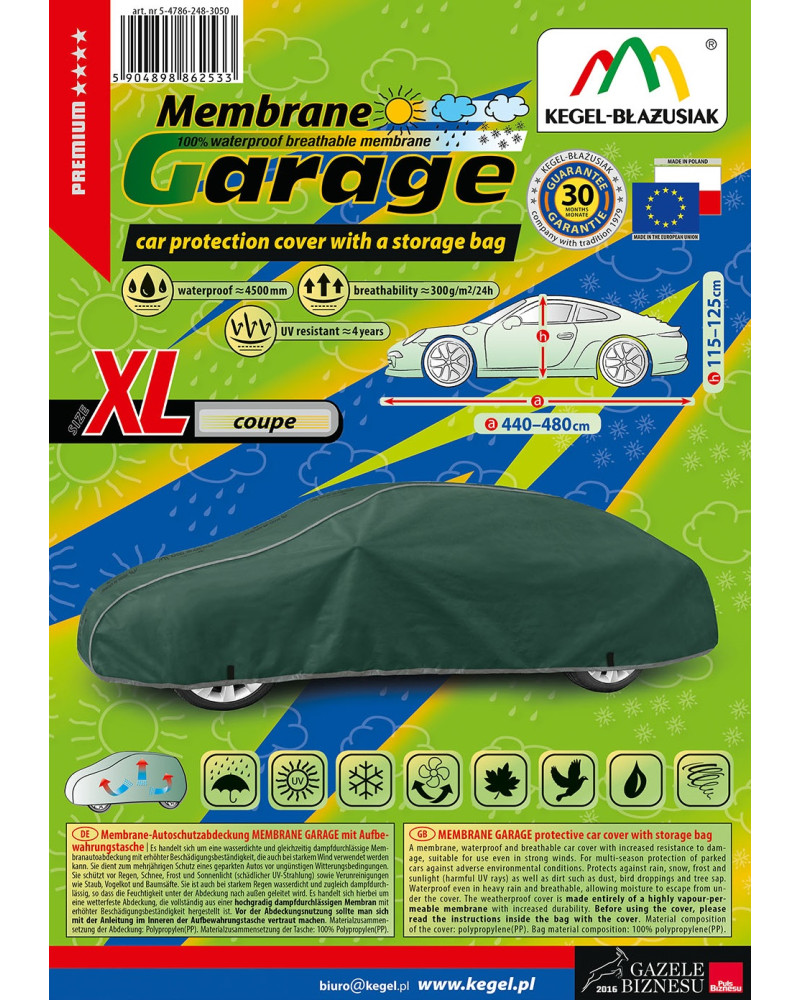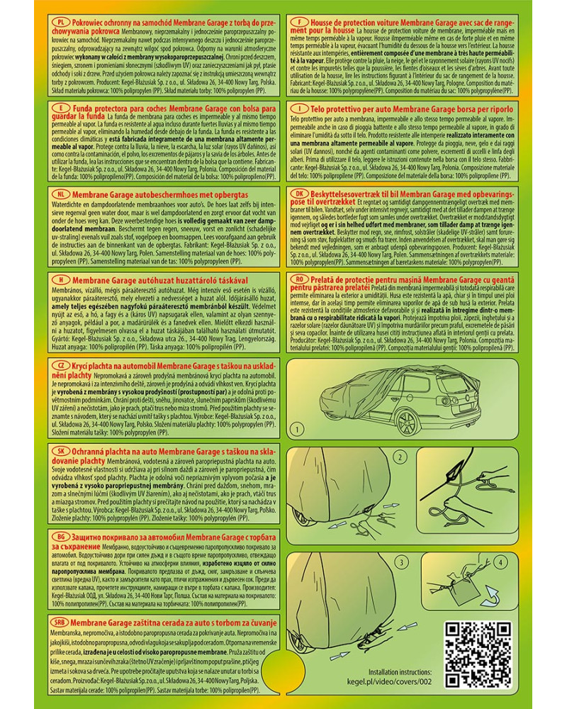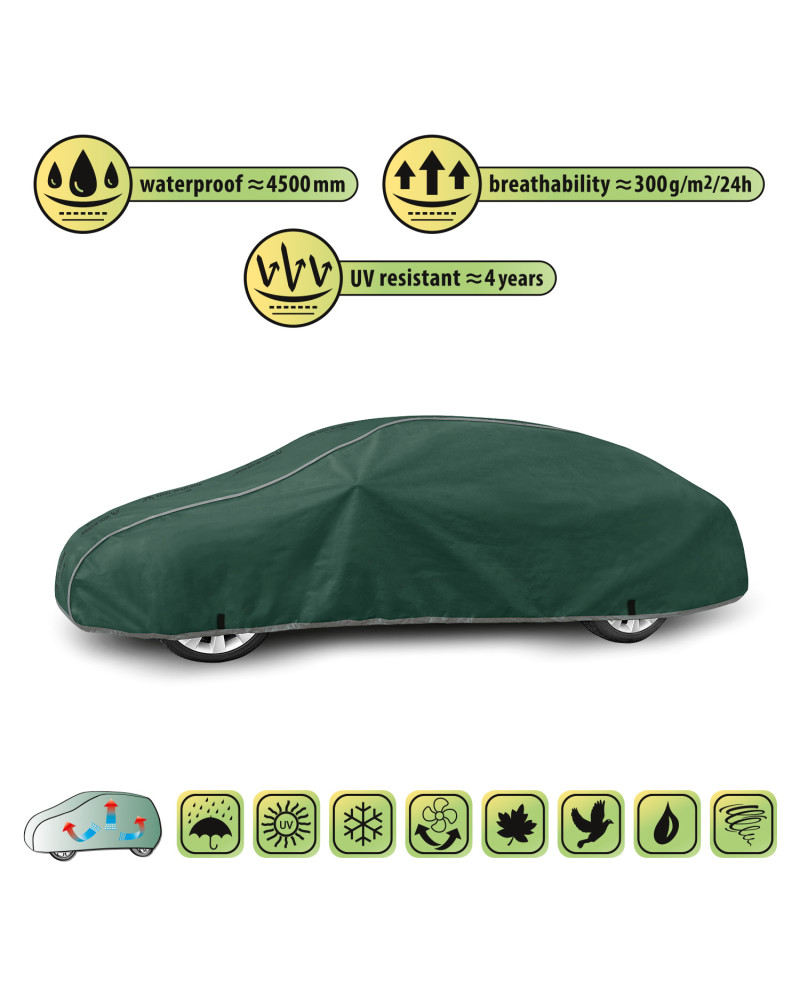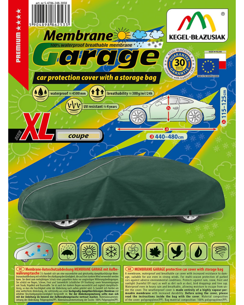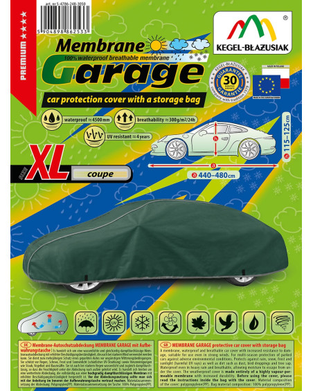 Nepromokavá a zároveň prodyšná membránová krycí plachta na automobil Membrane Garage. Je nepromokavá i za intenzívního deště, zároveň je prodyšná a odvádí vlhkost ven. Krycí plachta je vyrobená z membrány s vysokou prodyšností (prostupností par) a je odolná proti povětrnostním podmínkám. Chrání proti dešti, sněhu, jinovatce, slunečním paprskům (škodlivému UV záření) a nečistotám, jako je prach, ptačí trus nebo míza stromů.