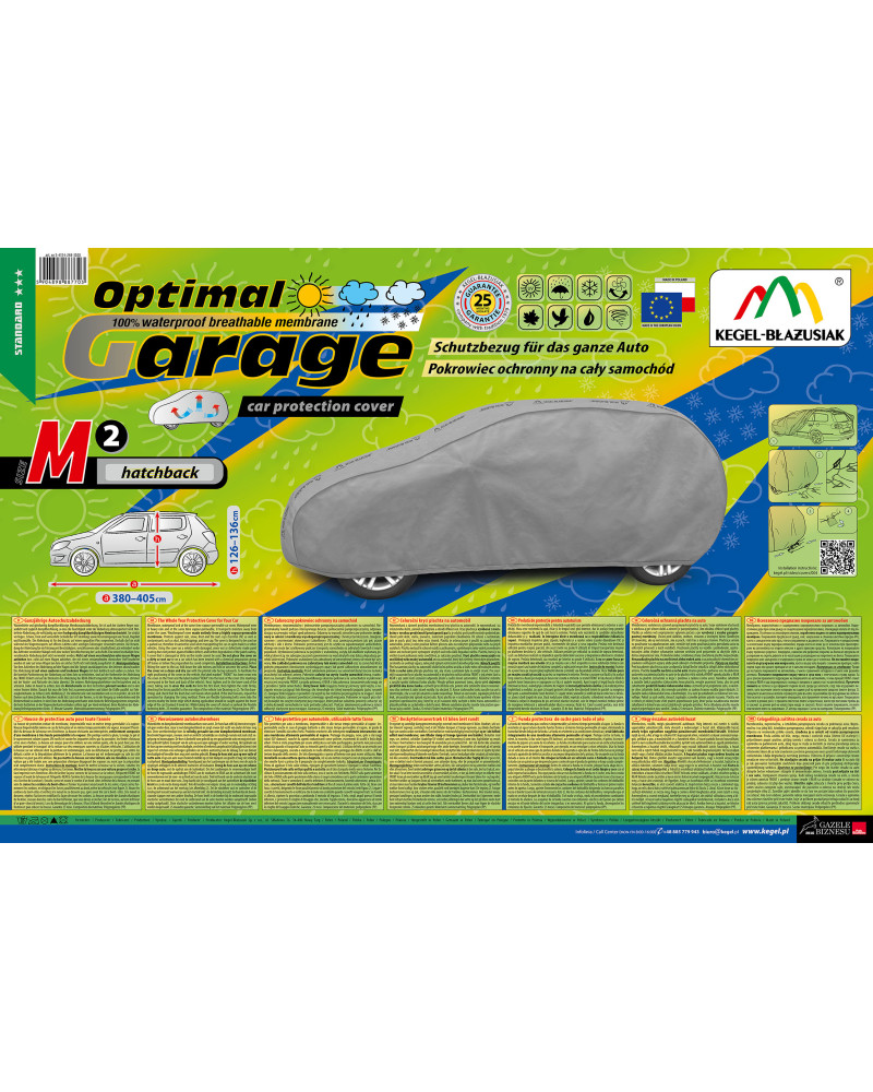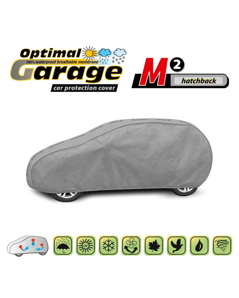 Nepromokavá a zároveň prodyšná membránová krycí plachta na automobil OPTIMAL GARAGE. Je nepromokavá i za intenzívního deště, zároveň je prodyšná a odvádí vlhkost ven. Krycí plachta je vyrobená z membrány s vysokou prodyšností (prostupností par) a je odolná proti povětrnostním podmínkám. Chrání proti dešti, sněhu, jinovatce, slunečním paprskům (škodlivému UV záření) a nečistotám, jako je prach, ptačí trus nebo míza stromů.