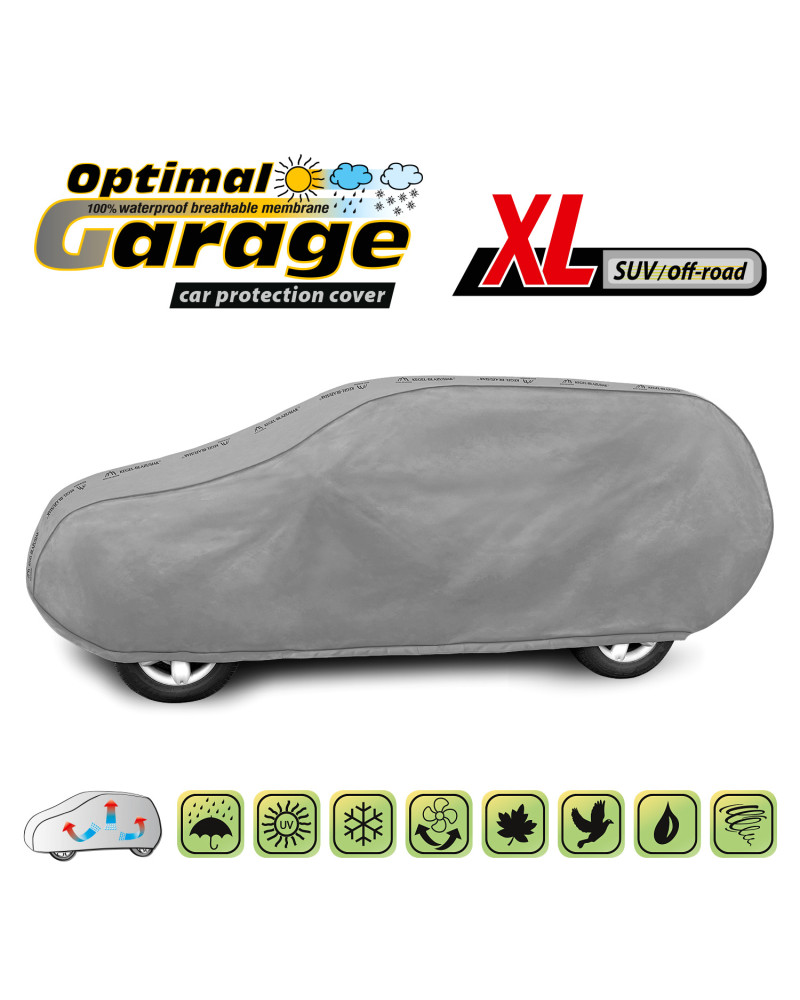 Nepromokavá a zároveň prodyšná membránová krycí plachta na automobil OPTIMAL GARAGE. Je nepromokavá i za intenzívního deště, zároveň je prodyšná a odvádí vlhkost ven. Krycí plachta je vyrobená z membrány s vysokou prodyšností (prostupností par) a je odolná proti povětrnostním podmínkám. Chrání proti dešti, sněhu, jinovatce, slunečním paprskům (škodlivému UV záření) a nečistotám, jako je prach, ptačí trus nebo míza stromů.
