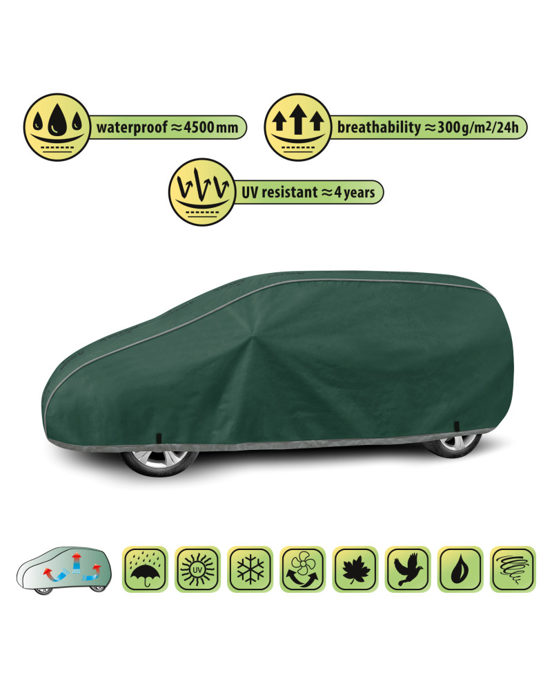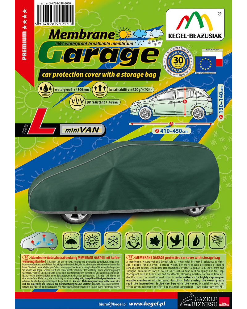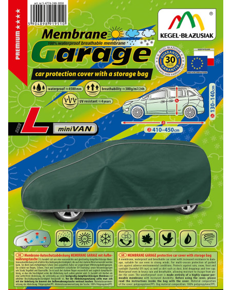 Nepromokavá a zároveň prodyšná membránová krycí plachta na automobil Membrane Garage. Je nepromokavá i za intenzívního deště, zároveň je prodyšná a odvádí vlhkost ven. Krycí plachta je vyrobená z membrány s vysokou prodyšností (prostupností par) a je odolná proti povětrnostním podmínkám. Chrání proti dešti, sněhu, jinovatce, slunečním paprskům (škodlivému UV záření) a nečistotám, jako je prach, ptačí trus nebo míza stromů.