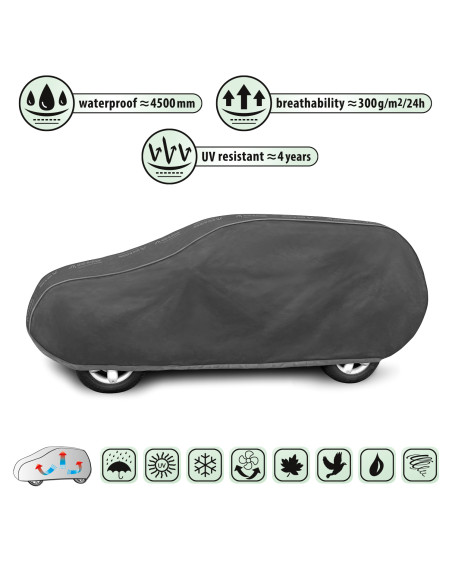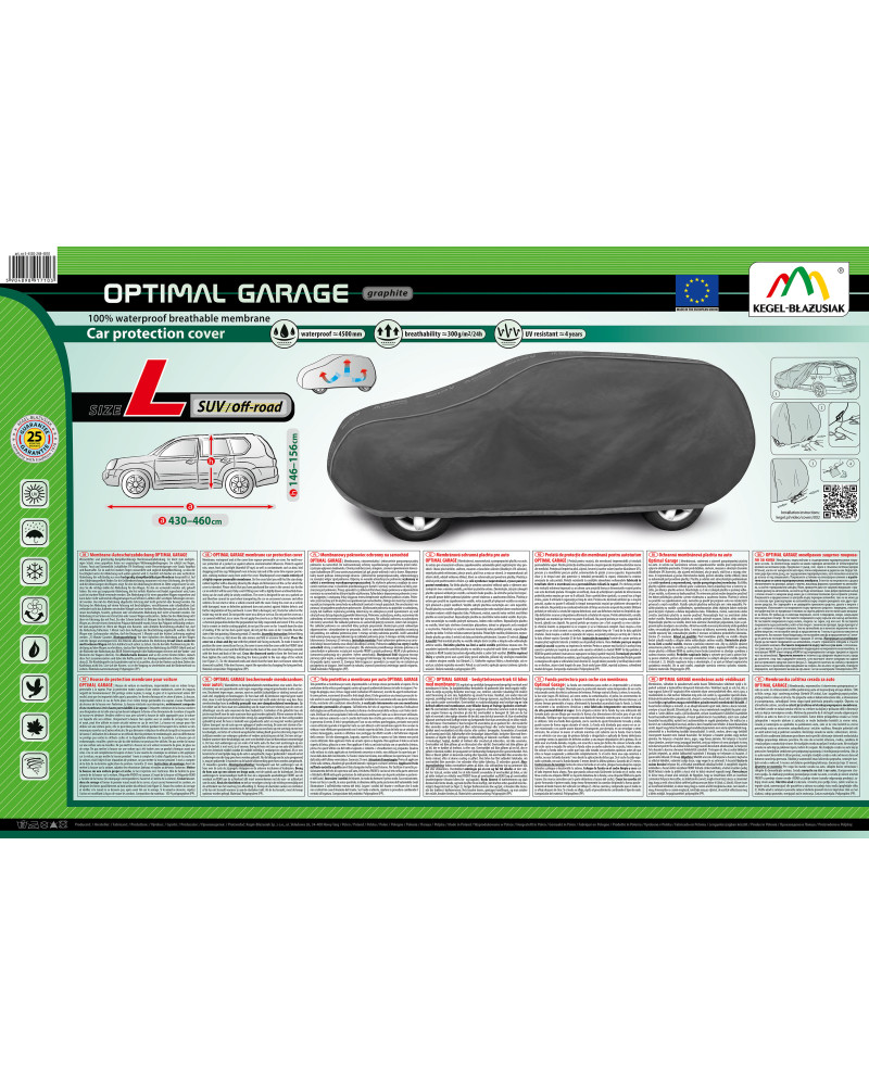 Nepromokavá a zároveň prodyšná membránová krycí plachta na automobil OPTIMAL GARAGE. Je nepromokavá i za intenzívního deště, zároveň je prodyšná a odvádí vlhkost ven. Krycí plachta je vyrobená z membrány s vysokou prodyšností (prostupností par) a je odolná proti povětrnostním podmínkám. Chrání proti dešti, sněhu, jinovatce, slunečním paprskům (škodlivému UV záření) a nečistotám, jako je prach, ptačí trus nebo míza stromů.