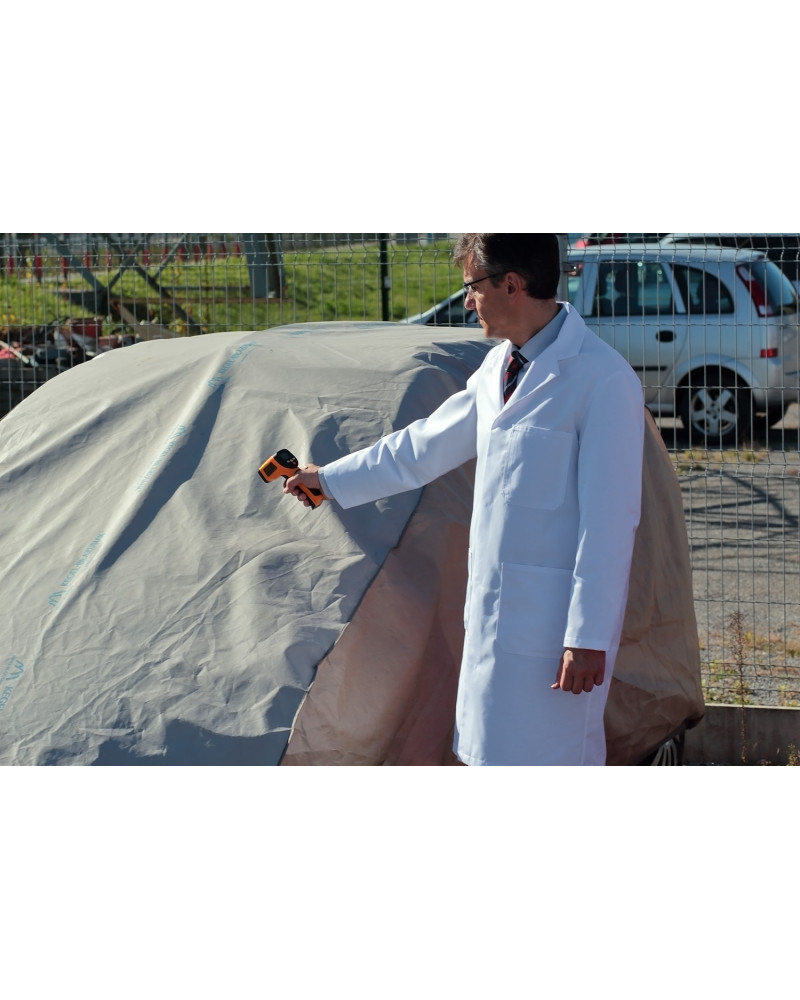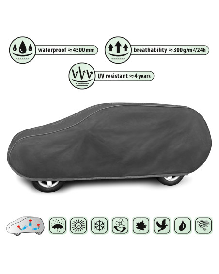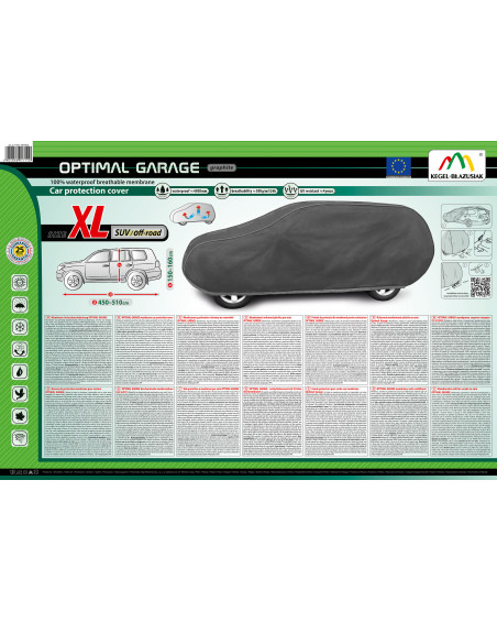 Nepromokavá a zároveň prodyšná membránová krycí plachta na automobil OPTIMAL GARAGE. Je nepromokavá i za intenzívního deště, zároveň je prodyšná a odvádí vlhkost ven. Krycí plachta je vyrobená z membrány s vysokou prodyšností (prostupností par) a je odolná proti povětrnostním podmínkám. Chrání proti dešti, sněhu, jinovatce, slunečním paprskům (škodlivému UV záření) a nečistotám, jako je prach, ptačí trus nebo míza stromů.