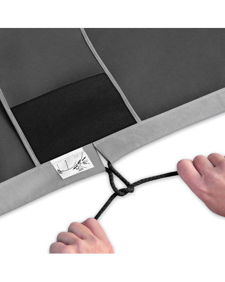 1. Nasaďte volný potah na relativně čisté auto, bílou stranou středového pásu dovnitř a následně maximálně silně zatáhněte za lanko stahovacího lemu plachty a správně ho zavažte.