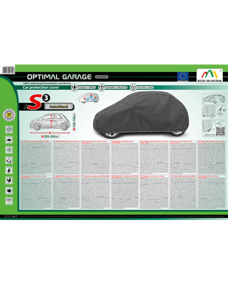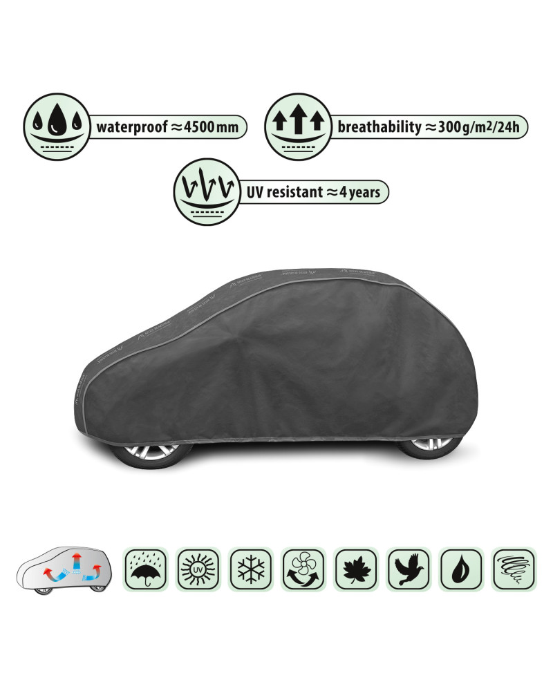 Nepromokavá a zároveň prodyšná membránová krycí plachta na automobil OPTIMAL GARAGE. Je nepromokavá i za intenzívního deště, zároveň je prodyšná a odvádí vlhkost ven. Krycí plachta je vyrobená z membrány s vysokou prodyšností (prostupností par) a je odolná proti povětrnostním podmínkám. Chrání proti dešti, sněhu, jinovatce, slunečním paprskům (škodlivému UV záření) a nečistotám, jako je prach, ptačí trus nebo míza stromů.