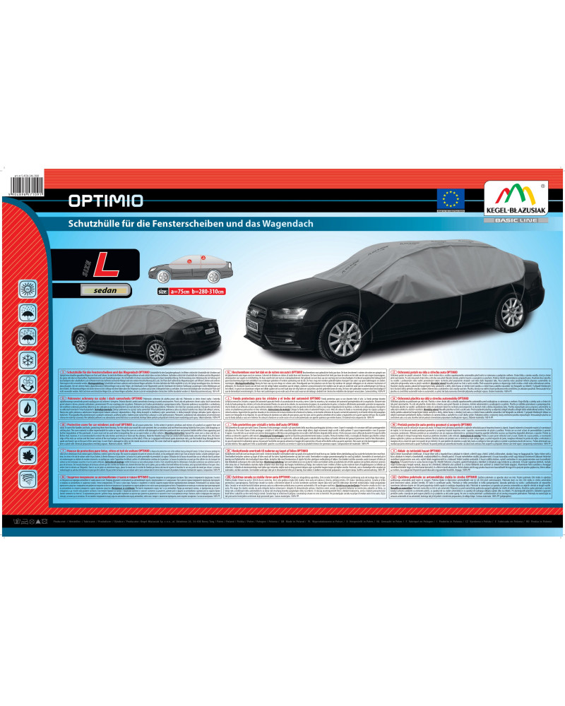 Automobil přikrytý poloplachtou OPTIMIO se tak rychle neochladí, pokud stojí na mrazu, v létě zůstane auto přikryté poloplachtou OPTIMIO uvnitř chladné tak, jakoby bylo zaparkované ve stínu. Plachty mají popelavou barvu, která je nesmírně praktická a zároveň skvěle vypadá. Výrobek je přizpůsobený jak pro nárazové, tak i pro dlouhodobé používání. Vznikl s ohledem na majitele aut, kteří nemají možnost garážování a nechávají své auto déle pod širým nebem. Výrobek se velmi snadno a rychle instaluje. Stačí pružné smyčky potahu zakončené bezpečnými háky zachytit o disky, dolní hranu ve střední části auta a o dolní hranu zadního nárazníku (montážní pokyny níže). Potah se pevně drží auta a nepohybuje se dokonce ani během úporného větru. Po složení nezabere plachta příliš místa, proto ji můžete vždy vozit s sebou.