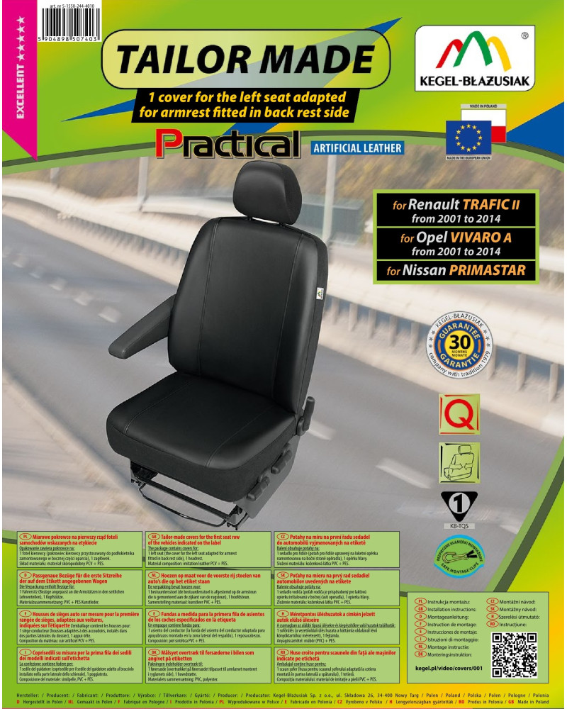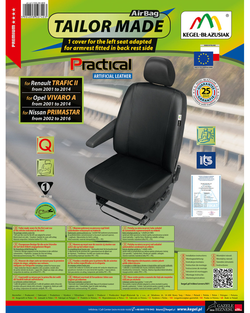 Přizpůsobené potahy PRACTICAL byly vyrobeny z nesmírně stálé ekokůže nové generace, což v kombinaci s péčí o zakončení i těch nejmenších detailů uspokojí dokonce i ty nejnáročnější zákazníky. Správně nasazené potahy jsou prakticky k nerozeznání od originálního koženého čalounění sedadel a tohoto efektu lze dosáhnout za skutečně nízkou cenu. Potah se vyrábí ze silného a stálého materiálu a díky správnému střihu se dobře přizpůsobí sedačkám a přilne k nim, čímž se zabraňuje posouvání potahu. Potahy do auta PRACTICAL velmi dobře chrání originální čalounění auta před prodřením a zničením a vkusný, moderní styl vyvolává pozitivní estetické dojmy. Potah se velice snadno instaluje a čistí. Poctivé provedení zaručuje vysokou kvalitu a dlouhou dobu používání. Nepromokavý, nešpinící se a nesmírně odolný materiál zajišťuje praktické používání. Nabídka cílí na majitele dodávkových automobilů, kteří se chtějí postarat o interiér svých vozidel a dodat jim šik a eleganci. Černá univerzální barevnost ideálně doplní interiér každého vozidla. Potahy vypadají skvěle v každém autě. Jsou výjimečně elegantní, proto také díky nim každý interiér získá na úrovni a na půvabu.