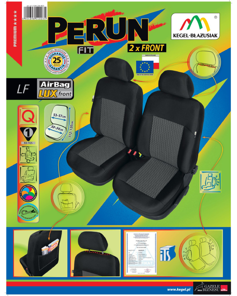 Přizpůsobené potahy PERUN to je nesmírně elegantní krytí sedaček osobních automobilů navržené profesionály z nejkvalitnějších materiálů. Velice stálý, silný, hoření zpomalující čalounický materiál z USA a z Polska, navíc z vnitřní strany potažený pěnou, zajišťuje dobrou přilnavost potahů a dobře se přizpůsobuje sedačkám, přičemž nahrazuje jejich originální čalounění. Materiál, z něhož jsou potahy vyrobeny, je velice stálý a odolný a především zpomaluje hoření. Materiál tohoto typu často používají automobilové koncerny k výrobě čalounění „exkluzivnějších“ sedaček. Příjemná textura vysoce kvalitní velurové látky zachovávající si klasickou, grafitovou barevnost s jemným béžovým vzorem se hodí do interiéru téměř každého automobilu. Funkčnost jde ruku v ruce se skvělým vzhledem. Elegantní vzhled ve spojení s nesmírně profesionální povrchovou úpravou nadchne každého. Potahy PERUN se trefí dokonce i do nejrafinovanějšího vkusu velmi náročných zákazníků. Dodají vnitřku auta šik vzhled a eleganci a ochrání čalounění před nečistotami veškerého druhu a před většinou poškození. Při koupi našich potahů máte jistotu, že získáte zboží nejvyšší úrovně, které budete moci používat po dlouhá léta. Poskytnuta až do 25-měsíční záruka vám dá jistotu, že kupujete nejvyšší kvality výrobku.