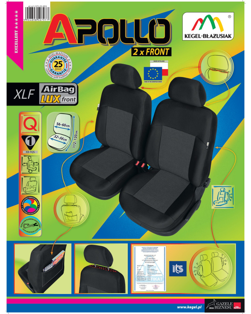 Přizpůsobené potahy APOLLO – byly vytvořeny s ohledem na zákazníky, kteří si cení vysoké kvality výrobku a zaměřují se přitom na jeho cenu. Potahy APOLLO to je jak dobrá kvalita, tak i atraktivní cena. Jsou vyrobeny z originálních, vysoce kvalitních čalounických materiálů, které se vyrábějí pro velké automobilové koncerny a vyznačují se stálostí a vysokou odolností. Materiál je zespodu potažen silnou, až 6milimetrovou, polyuretanovou pěnou společně s doplňující vrstvou šifonu, díky čemuž potahy dobře přiléhají k autosedačkám a neposouvají se. Potahy Apollo přinášejí spojení vysoké funkčnosti s opravdu atraktivním vzhledem. Nejen že ochrání originální čalounění vašeho auta před prodřením, znečištěním nebo zničením, ale také zatraktivní interiér vašeho vozidla. Potahy se vyrábějí převážně v jednotné černé barvě. Střed potahu je pak grafitový (s jemným vzorkem). Tlumené, klasické kombinace barev se hodí do každého interiéru. Díky všem těmto vlastnostem budou potahy APOLLO vypadat uvnitř vašeho auta opravdu skvěle. Potahy Apollo navíc zajišťují pohodlné používání, protože jsou zespodu potaženy silnou pěnou, můžete se na nich pohodlně usadit. Poskytnuta až do 25-měsíční záruka vám dá jistotu, že kupujete nejvyšší kvality výrobku.