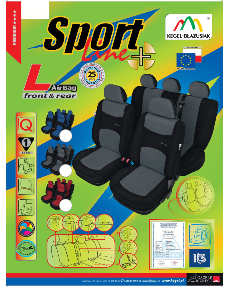 Elegance a sportovní vzhled jsou dvě základní vlastnosti, jimž se odlišují univerzální přizpůsobené potahy řady SPORT LINE. Vyrábějí se ve třech barevných variantách - modré, červené a grafitové, v intenzivních, i když ztlumených barevných odstínech. Potahy určené pro konkrétní modely aut se přizpůsobí sedačkám a přilnou k nim - dobrou přilnavost zajišťuje potažení polyuretanovou pěnou z vnitřní strany. Potahy mají speciální bezpečné švy pro airbagy, díky tomu jsou přizpůsobeny pro automobily jak s bočními airbagy v sedačkách, tak i se standardními sedačkami. Poskytnuta až do 25-měsíční záruka vám dá jistotu, že kupujete nejvyšší kvality výrobku.