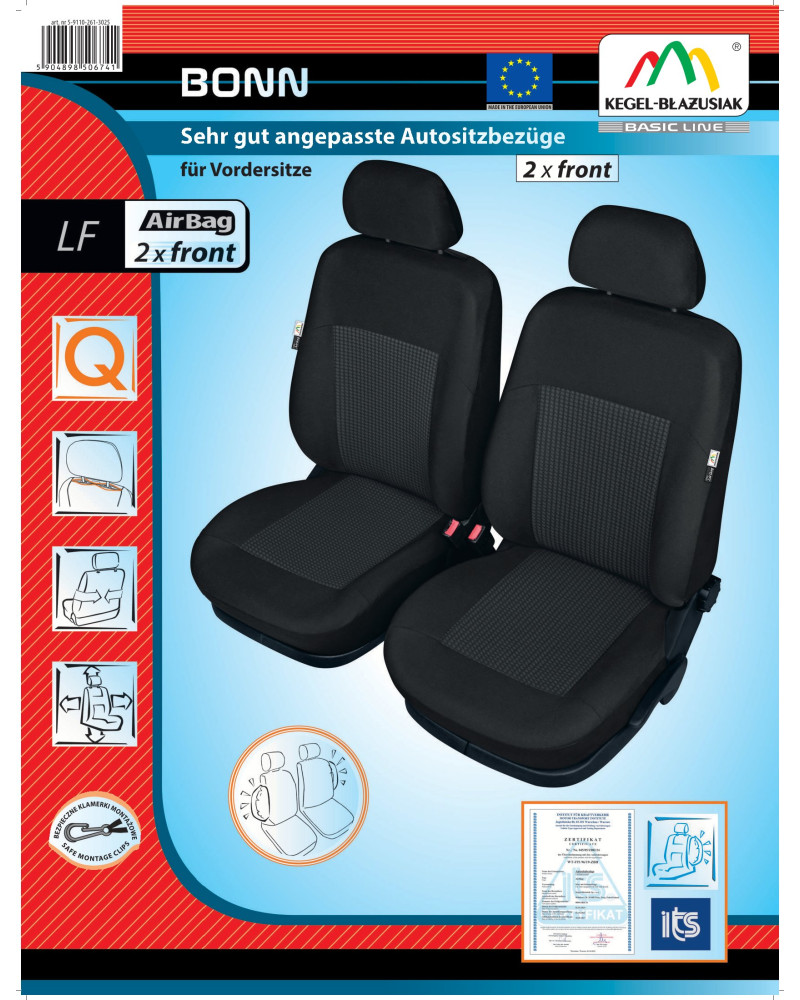 Univerzální přizpůsobené potahy BONN jsou velice atraktivní a elegantní potahy, které si můžete koupit za opravdu nízkou cenu. Díky vhodnému střihu a potažení PUR pěnou na vnitřní straně dobře přilnou k vlastnímu čalounění sedačky. Vyrobené s ohledem na konkrétní modely aut, dobře se přizpůsobí sedačkám a kromě toho zajišťují uživatelský komfort. Jsou vyrobeny ze silné, stálé žakárové látky a zaručují opravdu dlouhý čas používání. Pokud chcete osvěžit interiér svého auta nebo mu dodat šik vzhled a eleganci - jste tady správně.