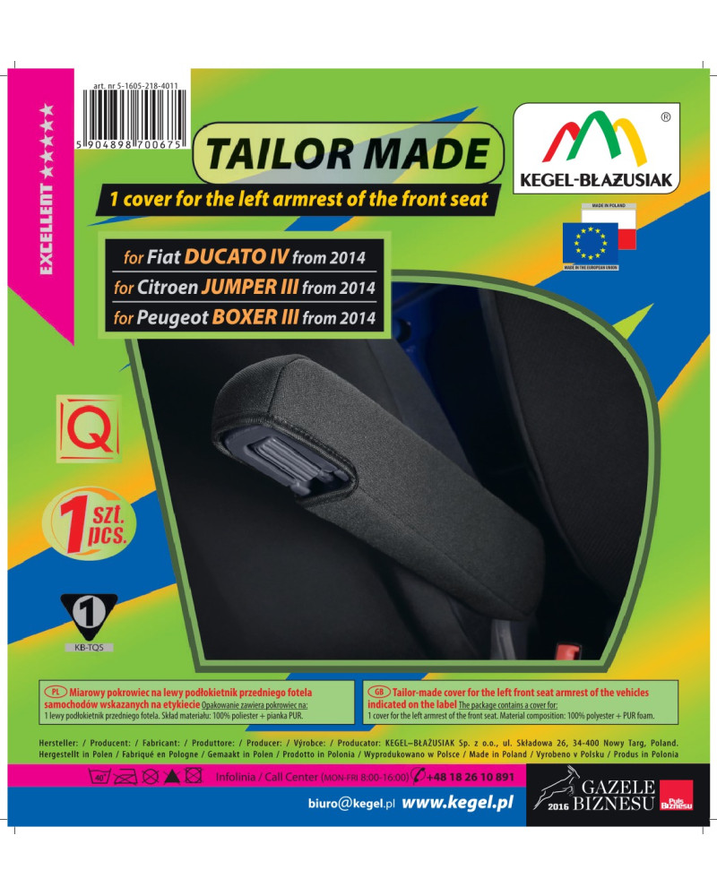 Potahy mají nezbytné, uzavíratelné otvory, které umožňují jejich natažení bez nutnosti vytahovat opěrky hlavy a zhotovovat další otvory. Předností potahů TAILOR MADE je to, že kryjí celý zadní povrch opěradla. Díky této vlastnosti vypadají velmi dobře také zezadu sedačky a zároveň ji chrání před znečištěním a poškozením (to je důležité především pro osoby, které mají malé děti). Sada je vybavena speciálními plastovými sponami, do materiálu jsou všitá připevnění, což s pomocí přiloženého obrázkového návodu k obsluze zajišťuje velmi snadnou instalaci. Potahy lze bez obav prát na 40° - podle pokynů na štítku. Výrobek renomované firmy Kegel-Błażusiak, největšího výrobce a exportéra v odvětví autopotahů a pracovních oděvů. Vyrobeno v Polsku, především z polských surovin, za dodržení všech kvalitativních standardů Evropské unie. Nákupem potahů Kegel-Błażusiak podporujete polskou ekonomiku a chráníte polská pracovní místa a také máte jistotu, že si kupujete výrobek nejvyšší kvality.