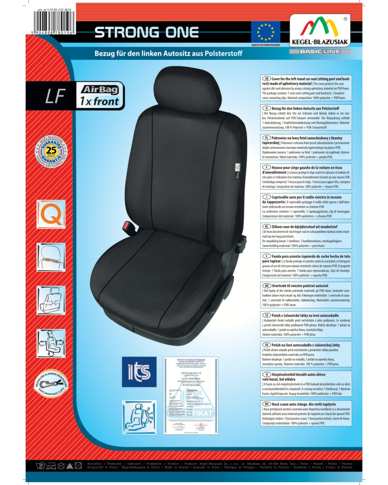 Návod k použití ilustrují obrázky 1 až 5. Jestliže potah nasazujete na levé sedadlo s bočním airbagem, musíte ho nasadit tak, aby se šev potahu s nášivkou „SRS-AIRBAG“ nacházel přesně na levé hraně sedadla (viz obrázek č. 2). Pokud autopotah nelze nasadit výše uvedeným způsobem (šev potahu s nášivkou „SRS-AIRBAG“ nekopíruje přesně levou hranu sedadla), v takovém případě potah nelze použít na sedadlo s bočním airbagem. Opotřebený, upravený nebo opravený autopotah nelze na sedadlech s bočními airbagy používat.