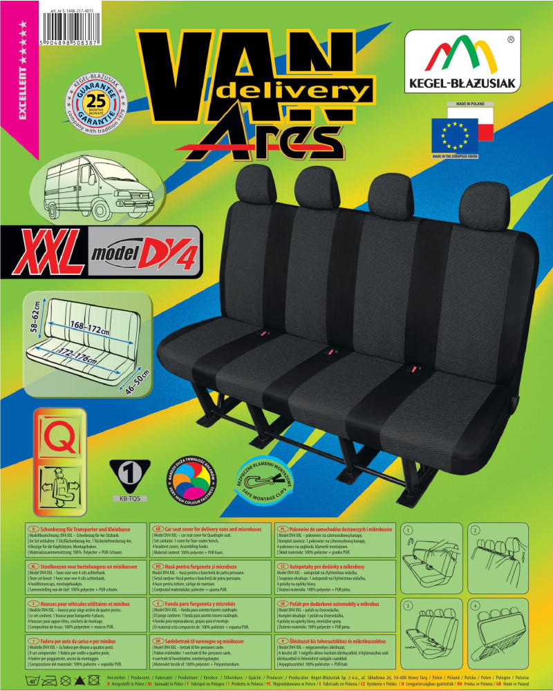 Přizpůsobené potahy ARES - praktické a bezpečné autopotahy navržené s ohledem na majitele dodávkových automobilů a mikrobusů - profesionálně ušité z hoření zpomalující žakárové látky vysoké kvality. Přesně z těch samých materiálů se vyrábějí originální potahy na sedačkách nových vozidel pro automobilky. Pečlivě ušité a důkladně propracované. Díky správnému střihu a vhodným rozměrům se skvěle přizpůsobí tvaru sedadel konkrétních modelů automobilů. Díky potažení PUR pěnou na vnitřní straně se vůči sedačce neposouvá. Potahy ARES efektivně chrání čalounění před prodřením, znečištěním a zničením, také uvnitř vozidla skvěle vypadají. Potahy jsou celé vyrobené z pevné, odolné, silné žakárové látky. Látka má černou barvu - černá s jemnou šedou texturou ideálně zapadne do interiéru každého automobilu. Poskytnuta až do 25-měsíční záruka vám dá jistotu, že kupujete nejvyšší kvality výrobku.