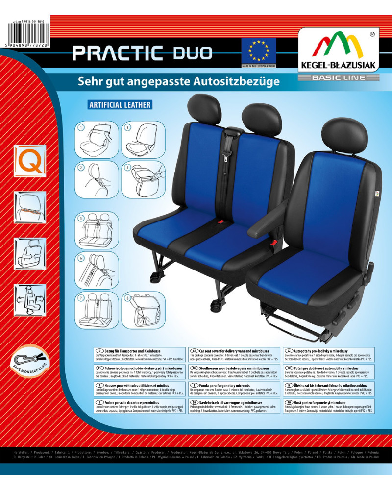 Přizpůsobené potahy PRACTIC DUO byly vyrobeny z nesmírně stálé ekokůže nové generace, což v kombinaci s péčí o zakončení i těch nejmenších detailů uspokojí dokonce i ty nejnáročnější zákazníky. Správně nasazené potahy jsou prakticky k nerozeznání od originálního koženého čalounění sedadel a tohoto efektu lze dosáhnout za skutečně nízkou cenu. Potah se vyrábí ze silného a stálého materiálu a díky správnému střihu se dobře přizpůsobí sedačkám a přilne k nim, čímž se zabraňuje posouvání potahu. Potahy do auta PRACTIC DUO velmi dobře chrání originální čalounění auta před prodřením a zničením a vkusný, moderní styl vyvolává pozitivní estetické dojmy. Potah se velice snadno instaluje a čistí. Poctivé provedení zaručuje vysokou kvalitu a dlouhou dobu používání. Nepromokavý, nešpinící se a nesmírně odolný materiál zajišťuje praktické používání. Nabídka cílí na majitele dodávkových automobilů, kteří se chtějí postarat o interiér svých vozidel a dodat jim šik a eleganci. Potahy vypadají skvěle v každém autě. Jsou výjimečně elegantní, proto také díky nim každý interiér získá na úrovni a na půvabu