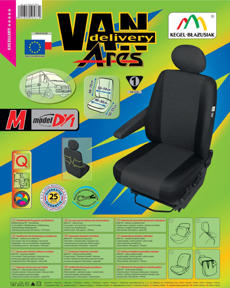 Přizpůsobené potahy ARES - praktické a bezpečné autopotahy navržené s ohledem na majitele dodávkových automobilů a mikrobusů - profesionálně ušité z hoření zpomalující žakárové látky vysoké kvality. Přesně z těch samých materiálů se vyrábějí originální potahy na sedačkách nových vozidel pro automobilky. Pečlivě ušité a důkladně propracované. Díky správnému střihu a vhodným rozměrům se skvěle přizpůsobí tvaru sedadel konkrétních modelů automobilů. Díky potažení PUR pěnou na vnitřní straně se vůči sedačce neposouvá. Potahy ARES efektivně chrání čalounění před prodřením, znečištěním a zničením, také uvnitř vozidla skvěle vypadají. Potahy jsou celé vyrobené z pevné, odolné, silné žakárové látky. Látka má černou barvu - černá s jemnou šedou texturou ideálně zapadne do interiéru každého automobilu. Poskytnuta až do 25-měsíční záruka vám dá jistotu, že kupujete nejvyšší kvality výrobku.
