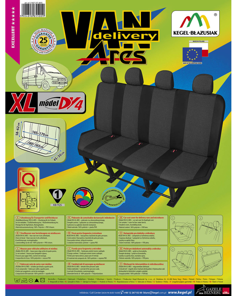 Přizpůsobené potahy ARES - praktické a bezpečné autopotahy navržené s ohledem na majitele dodávkových automobilů a mikrobusů - profesionálně ušité z hoření zpomalující žakárové látky vysoké kvality. Přesně z těch samých materiálů se vyrábějí originální potahy na sedačkách nových vozidel pro automobilky. Pečlivě ušité a důkladně propracované. Díky správnému střihu a vhodným rozměrům se skvěle přizpůsobí tvaru sedadel konkrétních modelů automobilů. Díky potažení PUR pěnou na vnitřní straně se vůči sedačce neposouvá. Potahy ARES efektivně chrání čalounění před prodřením, znečištěním a zničením, také uvnitř vozidla skvěle vypadají. Potahy jsou celé vyrobené z pevné, odolné, silné žakárové látky. Látka má černou barvu - černá s jemnou šedou texturou ideálně zapadne do interiéru každého automobilu. Poskytnuta až do 25-měsíční záruka vám dá jistotu, že kupujete nejvyšší kvality výrobku.