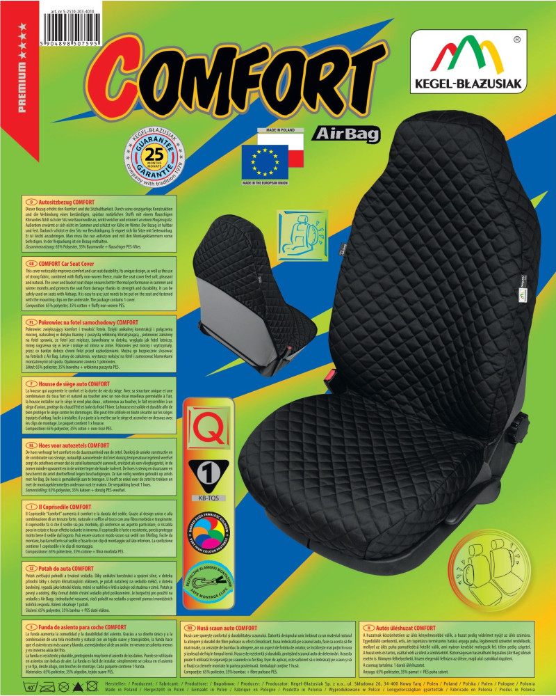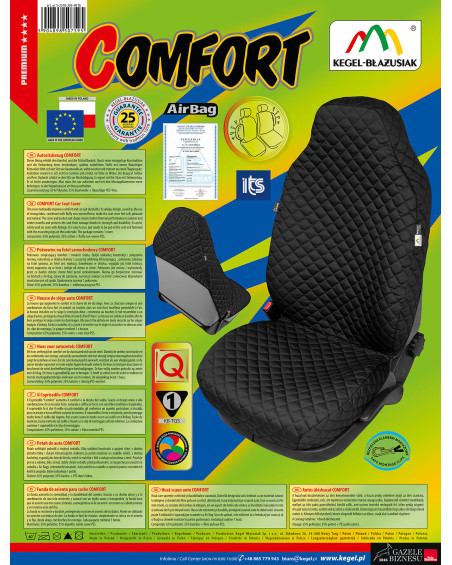 Potah COMFORT je jedinečné spojení přírodní bavlněné látky s nadýchanou klimatizační textilií, díky čemuž je potah skutečně silný a navíc měkký a pružný. Umožňuje uživateli pohodlně se do něj ponořit, díky čemuž bude cesta mnohem příjemnější. Materiál se vyznačuje téměř100% stálostí barev a odolností vůči obarvení, prodření, blednutí. Je silný, pevný a odolný a zároveň velice jemný na dotyk, téměř jako čistá bavlna. Potah zajišťuje účinnou izolaci - slabě se nahřívá v létě a v zimě izoluje před chladem. Potah COMFORT efektivně chrání sedačku před poškozením a znečištěním. Potah velmi dobře plní svou ochrannou funkci, protože kryje celou sedačku společně s boky a opěrkou hlavy. Ochrana opěrky hlavy se pojí s celým potahem, díky tomu sedačka po jeho nasazení vypadá skvěle a skoro jako letecká sedačka. Zajišťuje bezpečnost, protože je přizpůsobený pro sedačky s bočními airbagy. Může být používán jak na sedačce pro řidiče, tak pro spolujezdce, protože bezpečný šev, který se roztrhne při vystřelení airbagu, je našit jak na levé, tak na pravé straně. Potah vyrobený v univerzální velikosti se hodí na většinu standardních autosedaček. Výrobek se velice snadno instaluje a čistí.