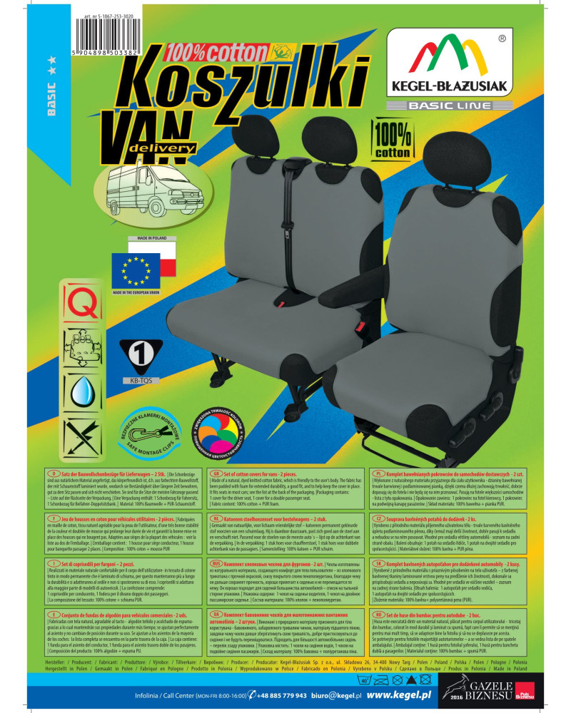 Trika COTTON DV (Delivery Van) jsou univerzální potahy určené do dodávkových automobilů vyrobené z 100% bavlny – vysoce kvalitního, přírodního materiálu. Profesionální provedení, péče o detaily a perfektní vzhled dokáží uspokojit i ty nejnáročnější zákazníky. Díky vhodné konstrukci potahy dobře přiléhají k sedačkám a to, že je z vnitřní strany celý materiál potažen PUR pěnou, zabraňuje jejich posunu. Trika se hodí téměř na každou autosedačku. Velice snadno se nasazují a rychle se stahují. Velmi jednoduše se také čistí. Potahy prodáváme jako sady - v sadě najděte jeden potah na sedačku a jeden na dvojsedačku. Samostatně se dají koupit také potahy na opěrky hlavy. Autotrika se mezi zákazníky po léta těší neměnnému zájmu. Ochrání a zároveň velice jasně promění autosedačky, čímž autu dodají jedinečný charakter.