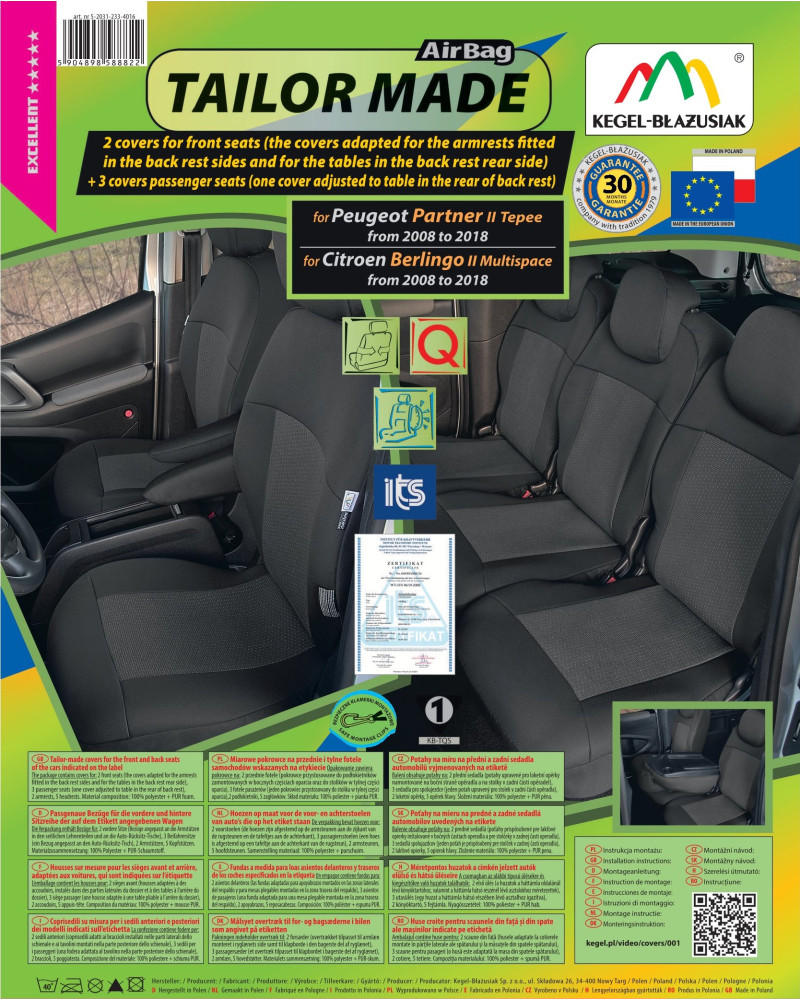 Potahy mají nezbytné, uzavíratelné otvory, které umožňují jejich natažení bez nutnosti vytahovat opěrky hlavy a zhotovovat další otvory. Předností potahů TAILOR MADE je to, že kryjí celý zadní povrch opěradla. Díky této vlastnosti vypadají velmi dobře také zezadu sedačky a zároveň ji chrání před znečištěním a poškozením (to je důležité především pro osoby, které mají malé děti). Sada je vybavena speciálními plastovými sponami, do materiálu jsou všitá připevnění, což s pomocí přiloženého obrázkového návodu k obsluze zajišťuje velmi snadnou instalaci. Potahy lze bez obav prát na 40° - podle pokynů na štítku. Výrobek renomované firmy Kegel-Błażusiak, největšího výrobce a exportéra v odvětví autopotahů a pracovních oděvů. Vyrobeno v Polsku, především z polských surovin, za dodržení všech kvalitativních standardů Evropské unie. Nákupem potahů Kegel-Błażusiak podporujete polskou ekonomiku a chráníte polská pracovní místa a také máte jistotu, že si kupujete výrobek nejvyšší kvality.