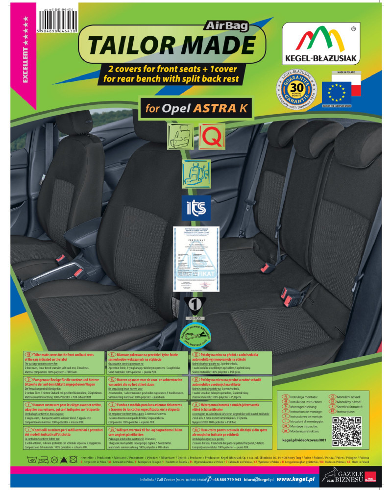 Potahy mají nezbytné, uzavíratelné otvory, které umožňují jejich natažení bez nutnosti vytahovat opěrky hlavy a zhotovovat další otvory. Předností potahů TAILOR MADE je to, že kryjí celý zadní povrch opěradla. Díky této vlastnosti vypadají velmi dobře také zezadu sedačky a zároveň ji chrání před znečištěním a poškozením (to je důležité především pro osoby, které mají malé děti). Sada je vybavena speciálními plastovými sponami, do materiálu jsou všitá připevnění, což s pomocí přiloženého obrázkového návodu k obsluze zajišťuje velmi snadnou instalaci. Potahy lze bez obav prát na 40° - podle pokynů na štítku. Výrobek renomované firmy Kegel-Błażusiak, největšího výrobce a exportéra v odvětví autopotahů a pracovních oděvů. Vyrobeno v Polsku, především z polských surovin, za dodržení všech kvalitativních standardů Evropské unie. Nákupem potahů Kegel-Błażusiak podporujete polskou ekonomiku a chráníte polská pracovní místa a také máte jistotu, že si kupujete výrobek nejvyšší kvality.