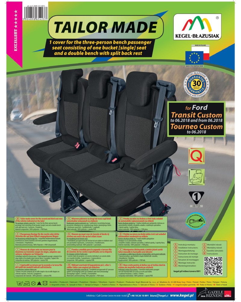 Potahy mají nezbytné, uzavíratelné otvory, které umožňují jejich natažení bez nutnosti vytahovat opěrky hlavy a zhotovovat další otvory. Předností potahů TAILOR MADE je to, že kryjí celý zadní povrch opěradla. Díky této vlastnosti vypadají velmi dobře také zezadu sedačky a zároveň ji chrání před znečištěním a poškozením (to je důležité především pro osoby, které mají malé děti). Sada je vybavena speciálními plastovými sponami, do materiálu jsou všitá připevnění, což s pomocí přiloženého obrázkového návodu k obsluze zajišťuje velmi snadnou instalaci. Potahy lze bez obav prát na 40° - podle pokynů na štítku. Výrobek renomované firmy Kegel-Błażusiak, největšího výrobce a exportéra v odvětví autopotahů a pracovních oděvů. Vyrobeno v Polsku, především z polských surovin, za dodržení všech kvalitativních standardů Evropské unie. Nákupem potahů Kegel-Błażusiak podporujete polskou ekonomiku a chráníte polská pracovní místa a také máte jistotu, že si kupujete výrobek nejvyšší kvality.