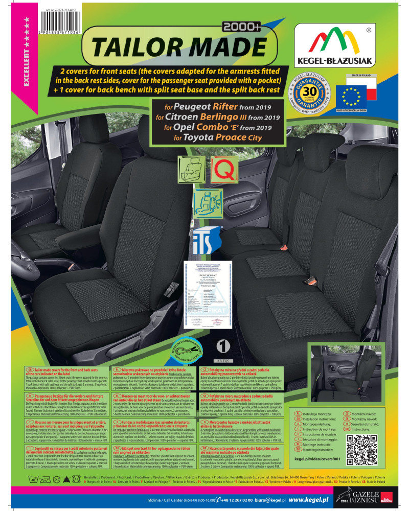 Potahy mají nezbytné, uzavíratelné otvory, které umožňují jejich natažení bez nutnosti vytahovat opěrky hlavy a zhotovovat další otvory. Předností potahů TAILOR MADE je to, že kryjí celý zadní povrch opěradla. Díky této vlastnosti vypadají velmi dobře také zezadu sedačky a zároveň ji chrání před znečištěním a poškozením (to je důležité především pro osoby, které mají malé děti). Sada je vybavena speciálními plastovými sponami, do materiálu jsou všitá připevnění, což s pomocí přiloženého obrázkového návodu k obsluze zajišťuje velmi snadnou instalaci. Potahy lze bez obav prát na 40° - podle pokynů na štítku. Výrobek renomované firmy Kegel-Błażusiak, největšího výrobce a exportéra v odvětví autopotahů a pracovních oděvů. Vyrobeno v Polsku, především z polských surovin, za dodržení všech kvalitativních standardů Evropské unie. Nákupem potahů Kegel-Błażusiak podporujete polskou ekonomiku a chráníte polská pracovní místa a také máte jistotu, že si kupujete výrobek nejvyšší kvality.