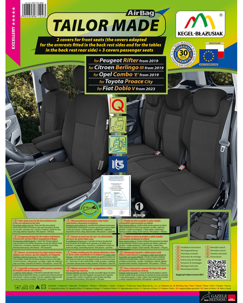 Potahy mají nezbytné, uzavíratelné otvory, které umožňují jejich natažení bez nutnosti vytahovat opěrky hlavy a zhotovovat další otvory. Předností potahů TAILOR MADE je to, že kryjí celý zadní povrch opěradla. Díky této vlastnosti vypadají velmi dobře také zezadu sedačky a zároveň ji chrání před znečištěním a poškozením (to je důležité především pro osoby, které mají malé děti). Sada je vybavena speciálními plastovými sponami, do materiálu jsou všitá připevnění, což s pomocí přiloženého obrázkového návodu k obsluze zajišťuje velmi snadnou instalaci. Potahy lze bez obav prát na 40° - podle pokynů na štítku. Výrobek renomované firmy Kegel-Błażusiak, největšího výrobce a exportéra v odvětví autopotahů a pracovních oděvů. Vyrobeno v Polsku, především z polských surovin, za dodržení všech kvalitativních standardů Evropské unie. Nákupem potahů Kegel-Błażusiak podporujete polskou ekonomiku a chráníte polská pracovní místa a také máte jistotu, že si kupujete výrobek nejvyšší kvality.