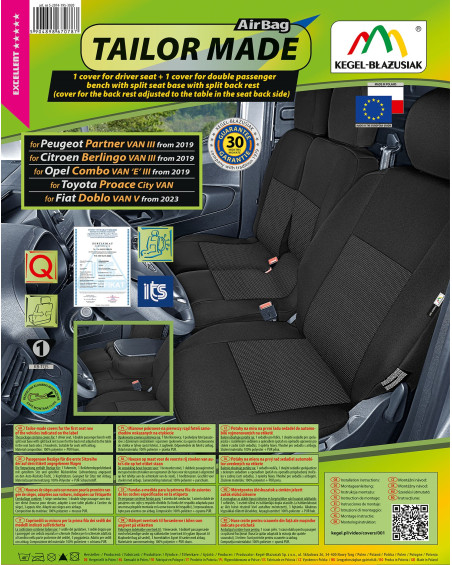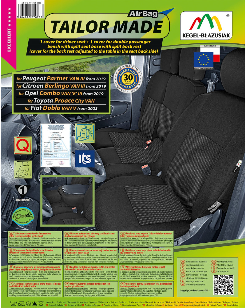Potahy mají nezbytné, uzavíratelné otvory, které umožňují jejich natažení bez nutnosti vytahovat opěrky hlavy a zhotovovat další otvory. Předností potahů TAILOR MADE je to, že kryjí celý zadní povrch opěradla. Díky této vlastnosti vypadají velmi dobře také zezadu sedačky a zároveň ji chrání před znečištěním a poškozením (to je důležité především pro osoby, které mají malé děti). Sada je vybavena speciálními plastovými sponami, do materiálu jsou všitá připevnění, což s pomocí přiloženého obrázkového návodu k obsluze zajišťuje velmi snadnou instalaci. Potahy lze bez obav prát na 40° - podle pokynů na štítku. Výrobek renomované firmy Kegel-Błażusiak, největšího výrobce a exportéra v odvětví autopotahů a pracovních oděvů. Vyrobeno v Polsku, především z polských surovin, za dodržení všech kvalitativních standardů Evropské unie. Nákupem potahů Kegel-Błażusiak podporujete polskou ekonomiku a chráníte polská pracovní místa a také máte jistotu, že si kupujete výrobek nejvyšší kvality.
