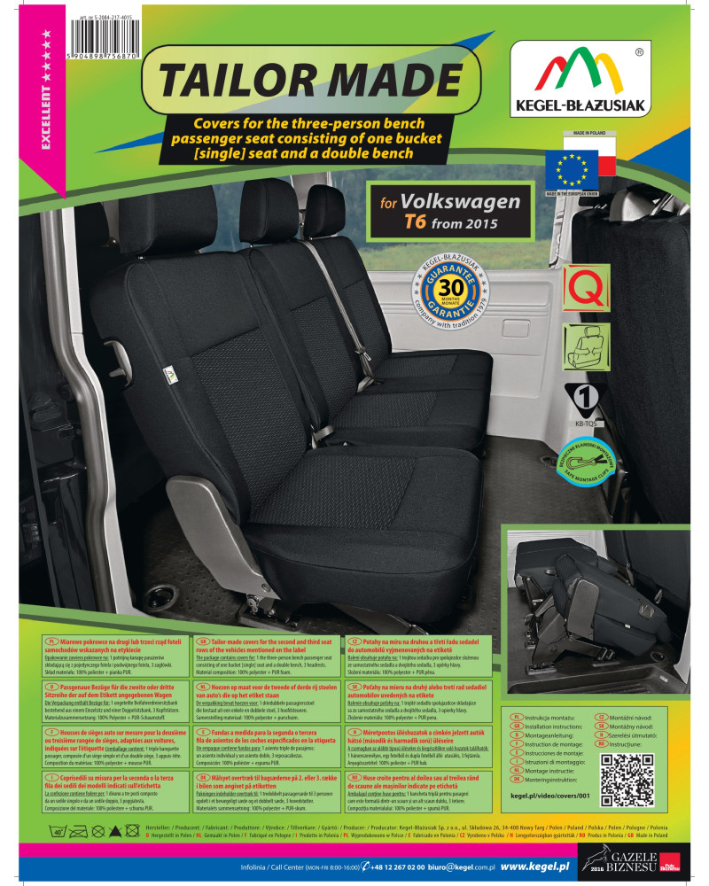 Potahy mají nezbytné, uzavíratelné otvory, které umožňují jejich natažení bez nutnosti vytahovat opěrky hlavy a zhotovovat další otvory. Předností potahů TAILOR MADE je to, že kryjí celý zadní povrch opěradla. Díky této vlastnosti vypadají velmi dobře také zezadu sedačky a zároveň ji chrání před znečištěním a poškozením (to je důležité především pro osoby, které mají malé děti). Sada je vybavena speciálními plastovými sponami, do materiálu jsou všitá připevnění, což s pomocí přiloženého obrázkového návodu k obsluze zajišťuje velmi snadnou instalaci. Potahy lze bez obav prát na 40° - podle pokynů na štítku. Výrobek renomované firmy Kegel-Błażusiak, největšího výrobce a exportéra v odvětví autopotahů a pracovních oděvů. Vyrobeno v Polsku, především z polských surovin, za dodržení všech kvalitativních standardů Evropské unie. Nákupem potahů Kegel-Błażusiak podporujete polskou ekonomiku a chráníte polská pracovní místa a také máte jistotu, že si kupujete výrobek nejvyšší kvality.