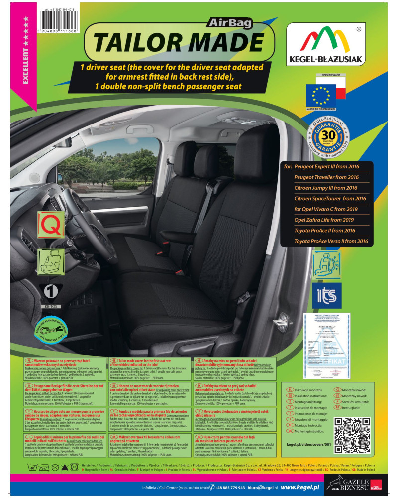 Potahy mají nezbytné, uzavíratelné otvory, které umožňují jejich natažení bez nutnosti vytahovat opěrky hlavy a zhotovovat další otvory. Předností potahů TAILOR MADE je to, že kryjí celý zadní povrch opěradla. Díky této vlastnosti vypadají velmi dobře také zezadu sedačky a zároveň ji chrání před znečištěním a poškozením (to je důležité především pro osoby, které mají malé děti). Sada je vybavena speciálními plastovými sponami, do materiálu jsou všitá připevnění, což s pomocí přiloženého obrázkového návodu k obsluze zajišťuje velmi snadnou instalaci. Potahy lze bez obav prát na 40° - podle pokynů na štítku. Výrobek renomované firmy Kegel-Błażusiak, největšího výrobce a exportéra v odvětví autopotahů a pracovních oděvů. Vyrobeno v Polsku, především z polských surovin, za dodržení všech kvalitativních standardů Evropské unie. Nákupem potahů Kegel-Błażusiak podporujete polskou ekonomiku a chráníte polská pracovní místa a také máte jistotu, že si kupujete výrobek nejvyšší kvality.