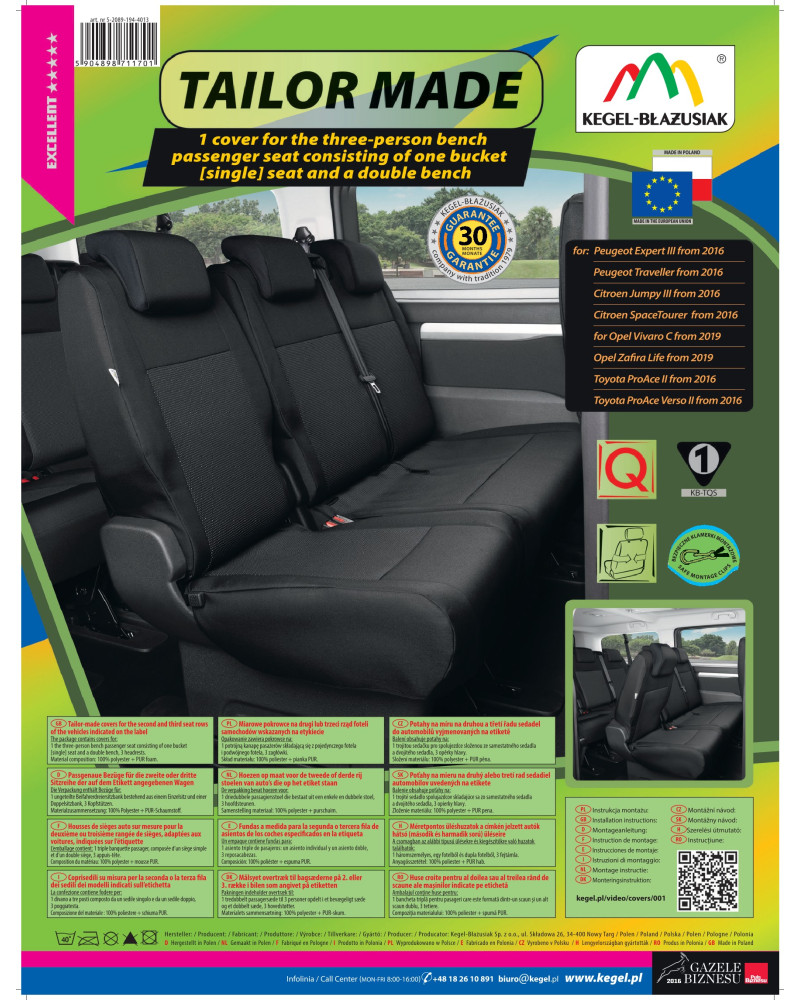 Potahy mají nezbytné, uzavíratelné otvory, které umožňují jejich natažení bez nutnosti vytahovat opěrky hlavy a zhotovovat další otvory. Předností potahů TAILOR MADE je to, že kryjí celý zadní povrch opěradla. Díky této vlastnosti vypadají velmi dobře také zezadu sedačky a zároveň ji chrání před znečištěním a poškozením (to je důležité především pro osoby, které mají malé děti). Sada je vybavena speciálními plastovými sponami, do materiálu jsou všitá připevnění, což s pomocí přiloženého obrázkového návodu k obsluze zajišťuje velmi snadnou instalaci. Potahy lze bez obav prát na 40° - podle pokynů na štítku. Výrobek renomované firmy Kegel-Błażusiak, největšího výrobce a exportéra v odvětví autopotahů a pracovních oděvů. Vyrobeno v Polsku, především z polských surovin, za dodržení všech kvalitativních standardů Evropské unie. Nákupem potahů Kegel-Błażusiak podporujete polskou ekonomiku a chráníte polská pracovní místa a také máte jistotu, že si kupujete výrobek nejvyšší kvality.
